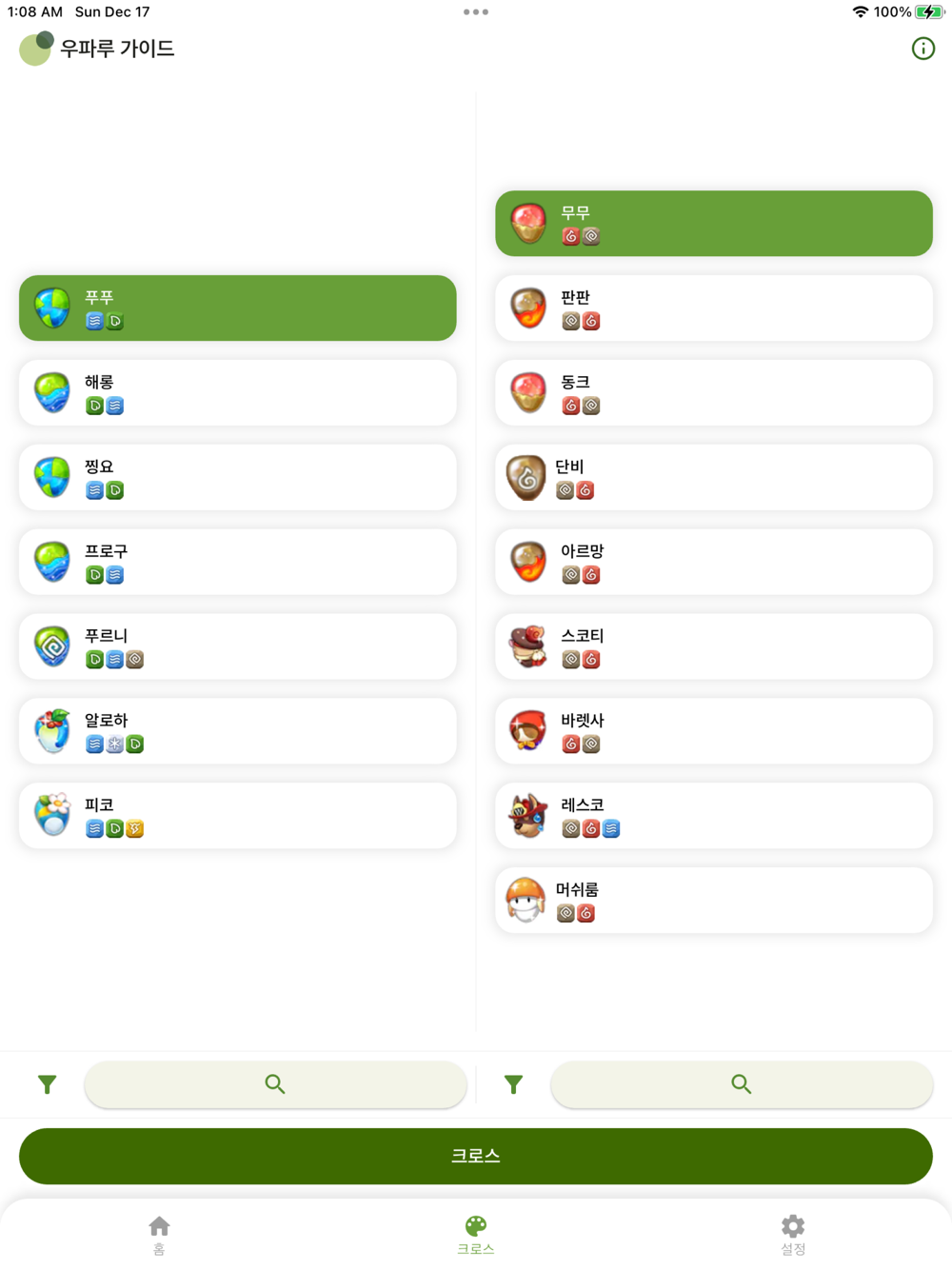 좋은 피드백을 모아 버그 수정 및 앱 개선이 이루어졌어요 ~- 신규 한정 우파루 메리와 코타 추가- 상극 특성 우파루끼리 크로스 가능한 이슈 수정- 크로스 결과에 루핀과 용가루가 나오지 않는 이슈 수정- 크로스 결과에서 보유 여부 확인 가능, 미보유 우파루 우선 노출- 전체 보유 / 미보유 설정 기능- 햅틱 진동 on / off 설정 기능