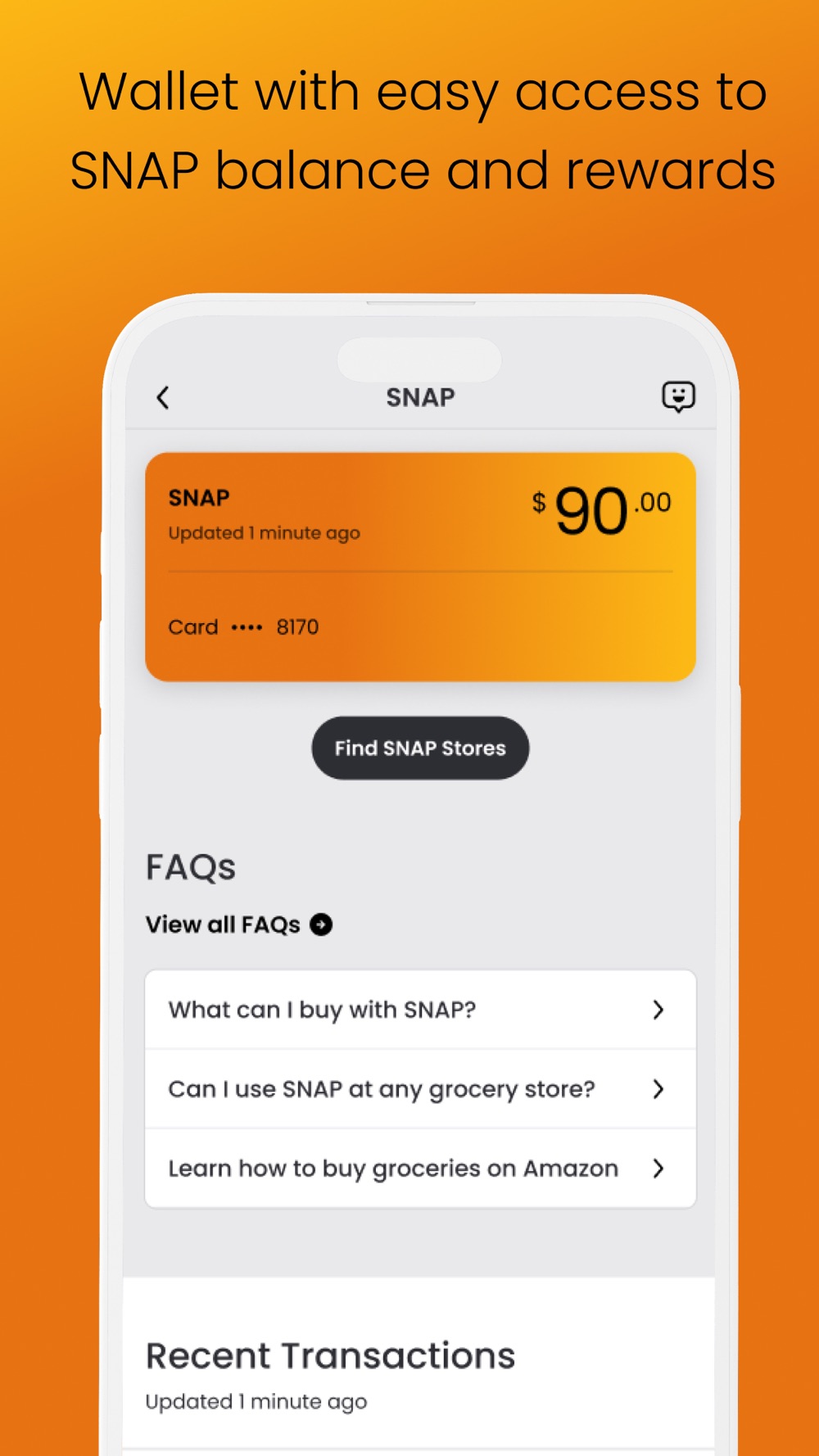 • SNAP balance: Check your available balance within the app. Watch your Supplemental Nutrition Assistance Program (SNAP) activity. Know your benefits to manage your food resources.