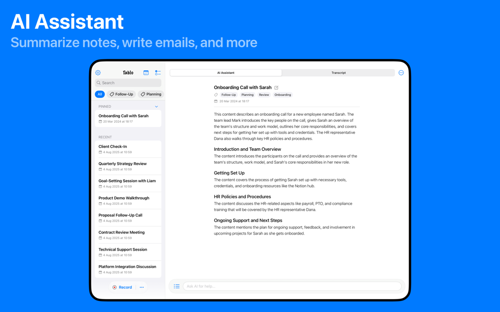 • Make every meeting more productive. Tablo gives you accurate transcription, AI-powered notes, and seamless sharing—so you can focus on the conversation, not the keyboard.