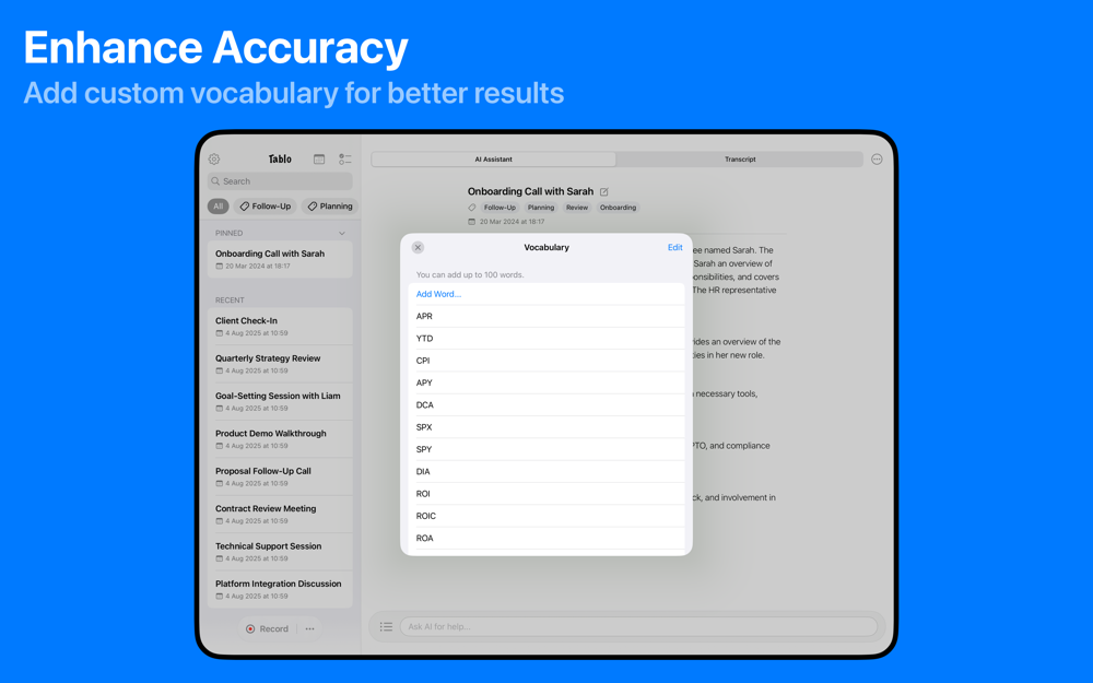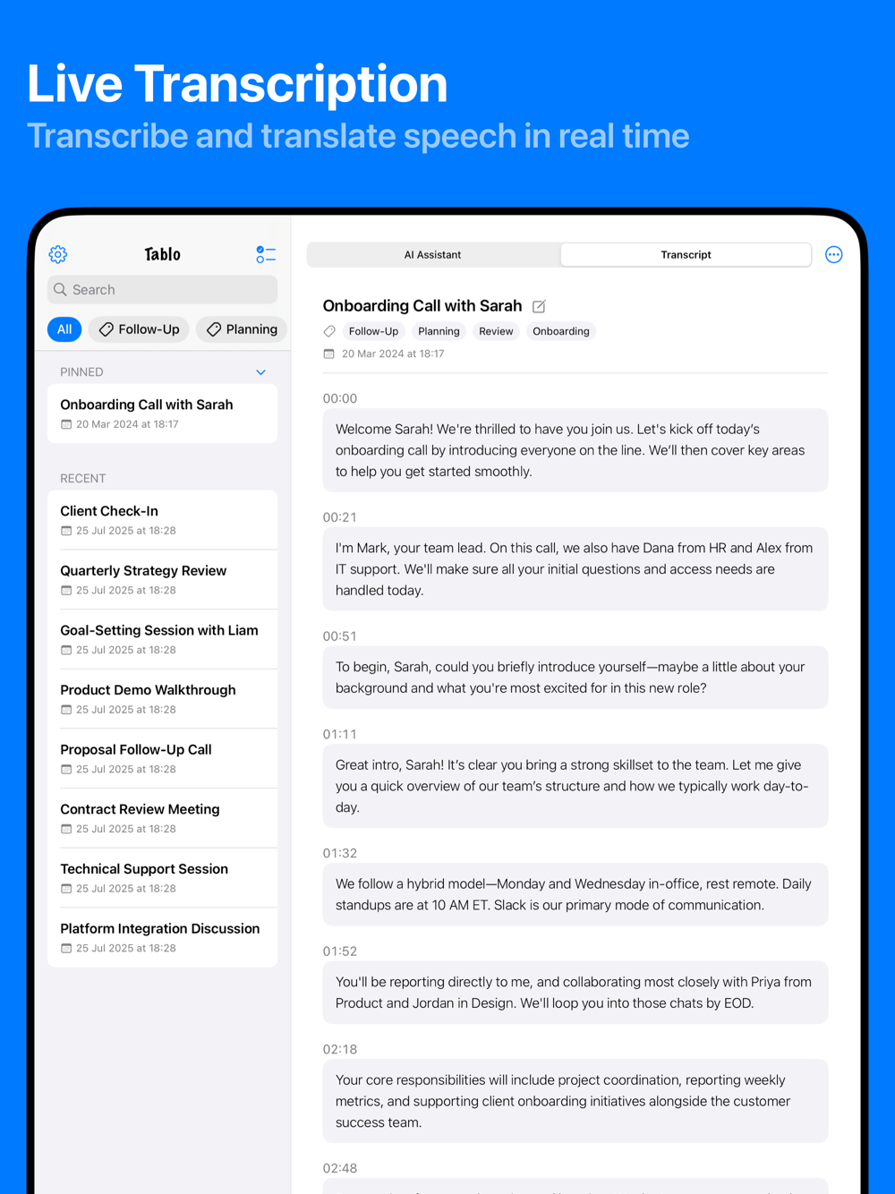 • Start recording with one tap. Tablo instantly transcribes your meetings and discussions with high accuracy, so you never miss a detail.