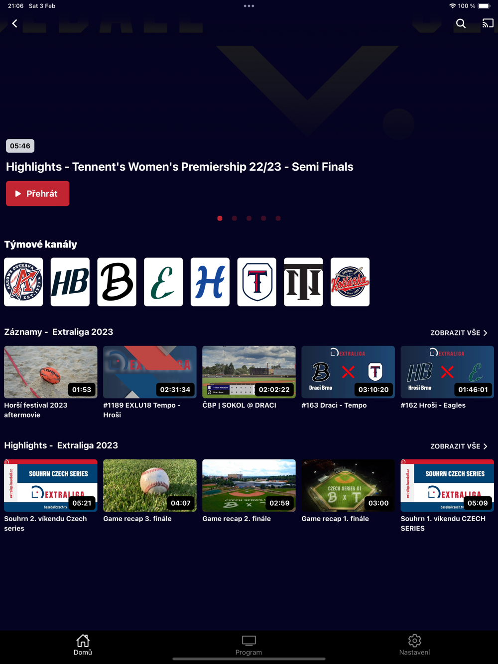 In addition to Czech baseball games, you can also find content produced by the clubs themselves. You won't miss any club content through the TV. In addition to live broadcasts, you can also find recordings, highlights and interviews in the app.