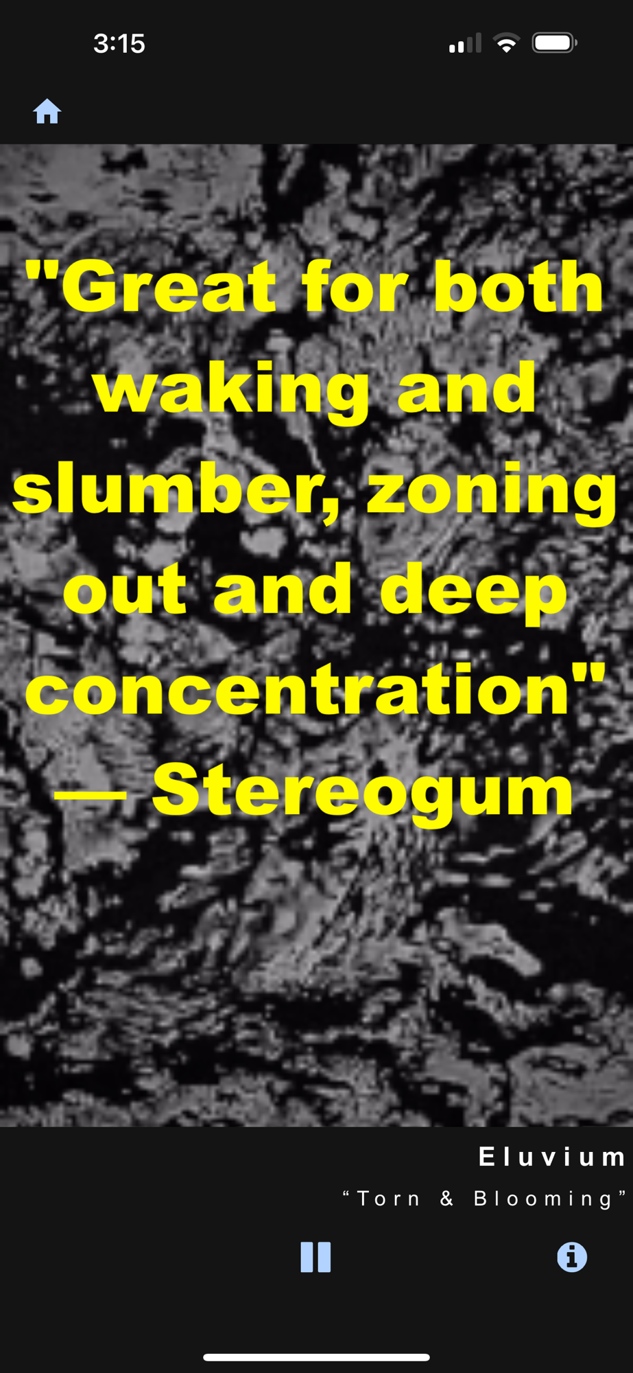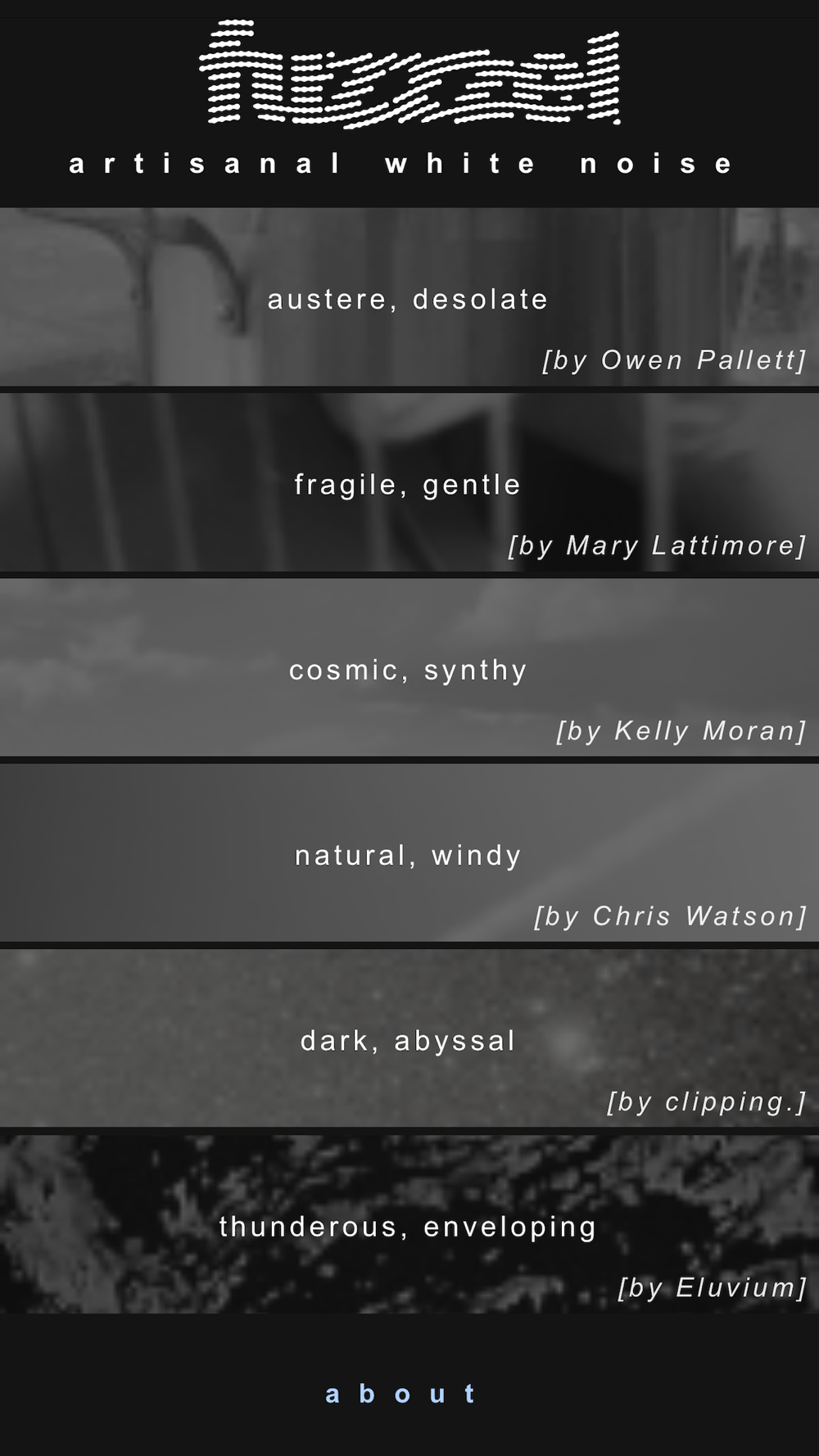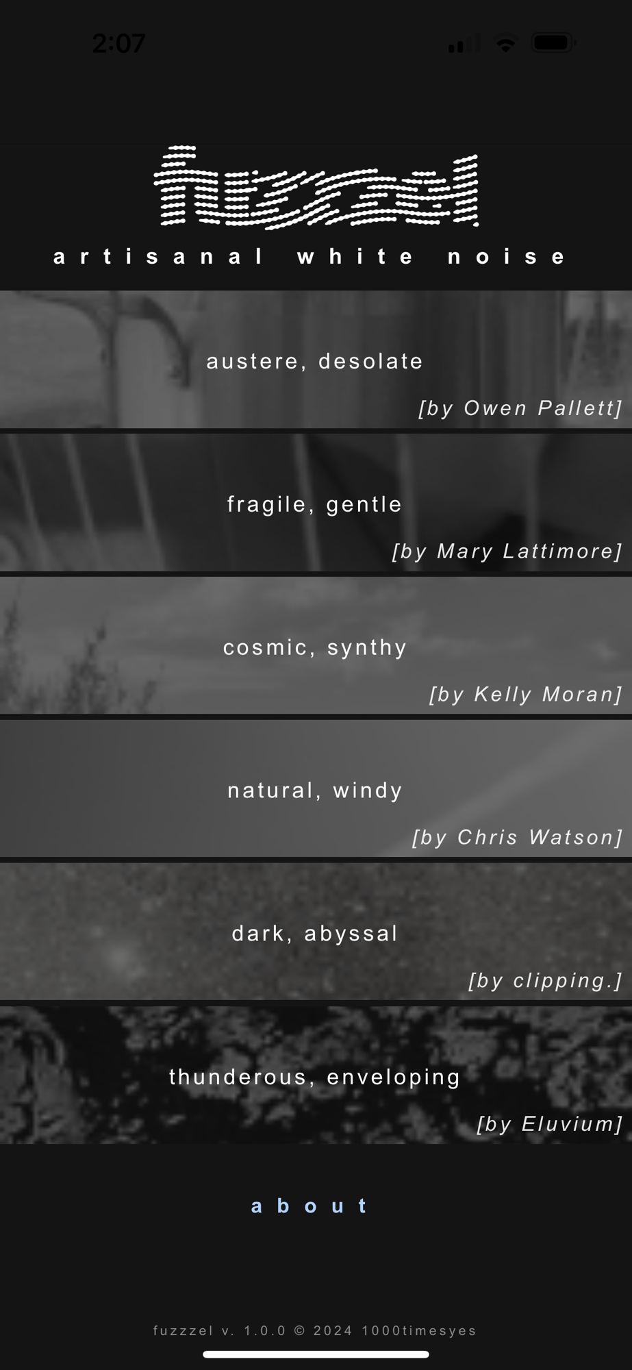 These longform explorations of static, drones, fuzz, wind and spectrum-filling oblivion make Fuzzzel not only a utilitarian sound-making device but a one-of-a-kind creative platform. Fuzzzel reroutes the demand for white noise into the hands of professionals, sound artists and creatives. Every piece on Fuzzzel is a lengthy, exclusive ambient journey created with the pulse of a human being and the ear of a gifted musician. Each piece — together totaling more than two hours of new music — loops indefinitely alongside a unique video provided by each artist.