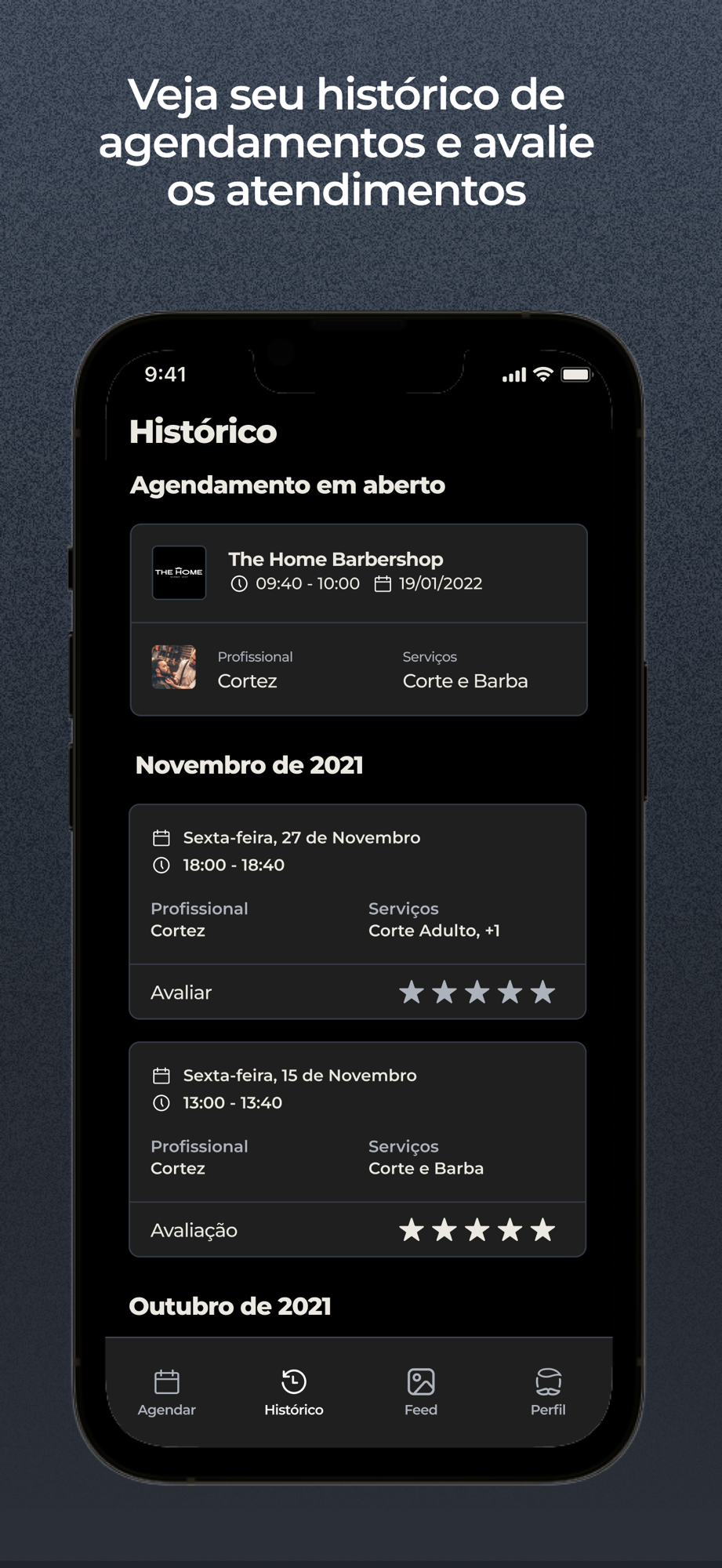 Através do App The Home Barbershop os clientes podem realizar seus agendamentos de uma forma muito mais prática. Na tela inicial, é possível selecionar os serviços e horário desejado para seu próximo atendimento. Já na tela de histórico, você poderá avaliar como foi o seu atendimento, remarcar ou cancelar seus agendamentos. É possível também na tela do perfil o cliente editar suas informações, como e-mail, foto de perfil e telefone.