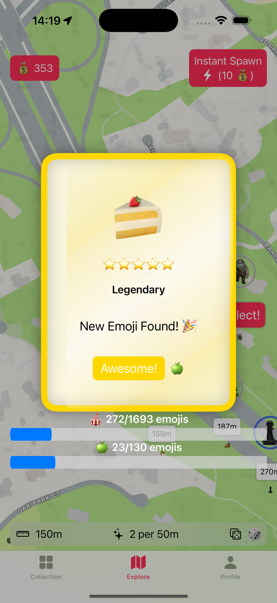 Collect Emojis : Get within range of the emojis (100m default) to pick them up