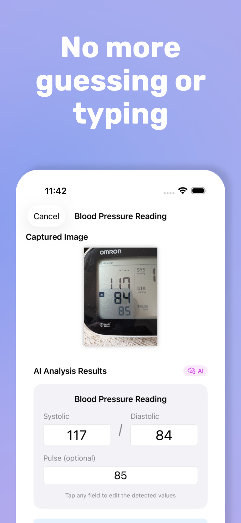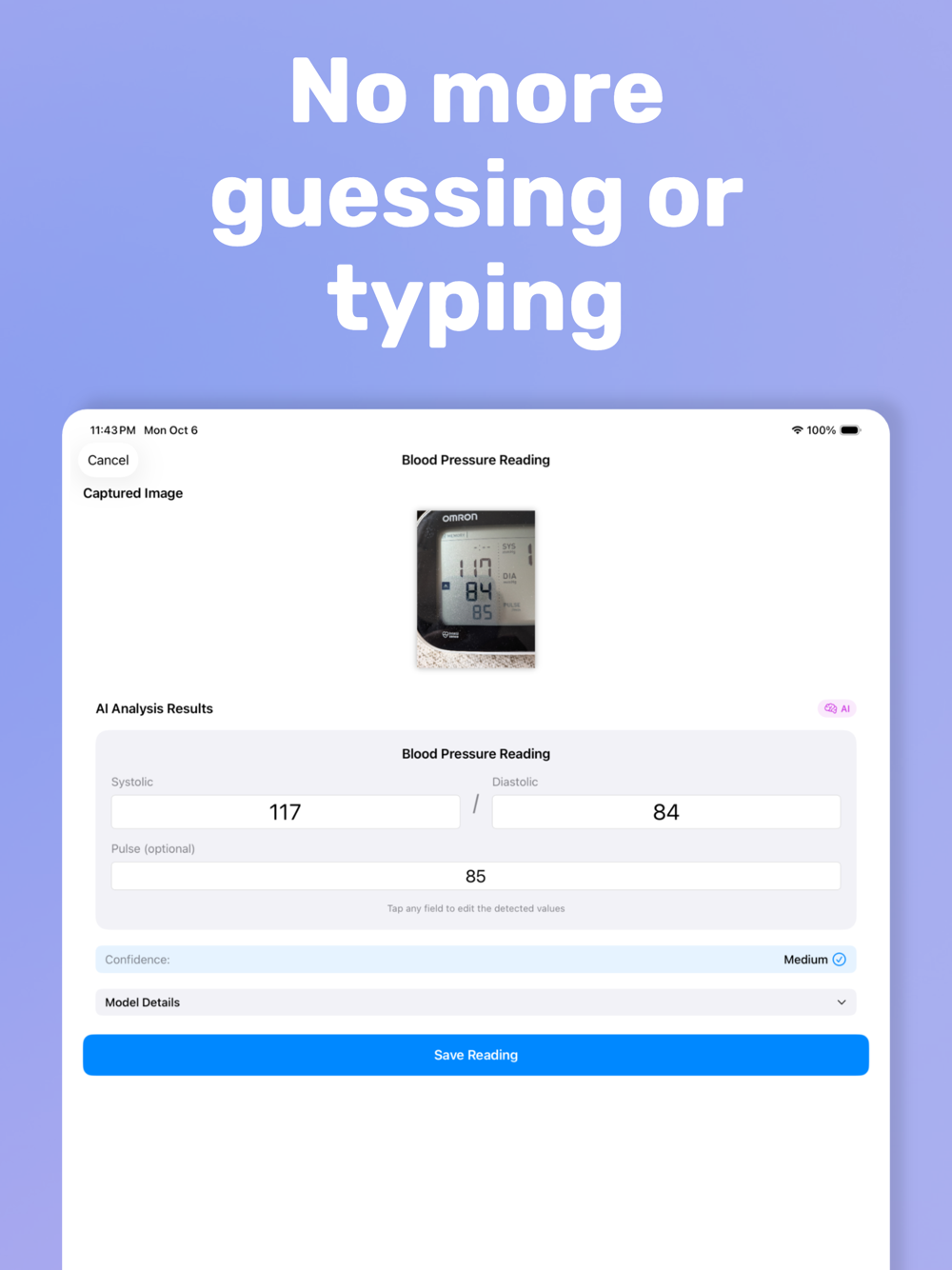 A simple blood pressure tracking tool, no fancy gadgets needed, just take a picture of ANY blood pressure monitor and we'll read, store, save, and share (if you choose) with whoever you want. This is perfect for keeping tabs on aging parents so you always know how they are doing and for tracking your own progress.