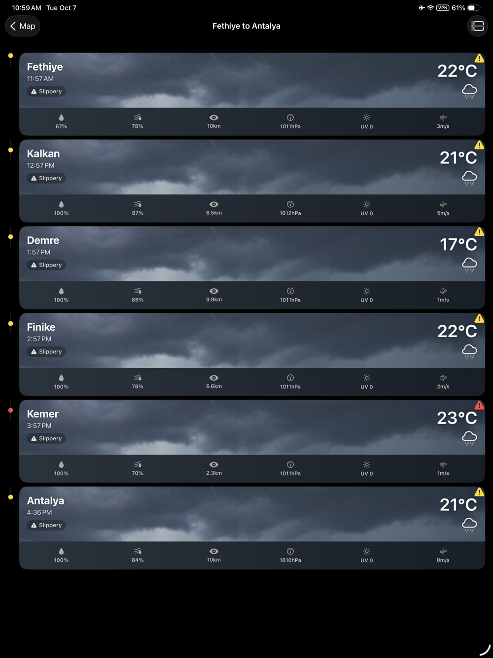 Route-Based Forecasts: See how weather conditions will change throughout your journey. The app divides your route into time-based segments with granular weather forecasts for each part of the drive.