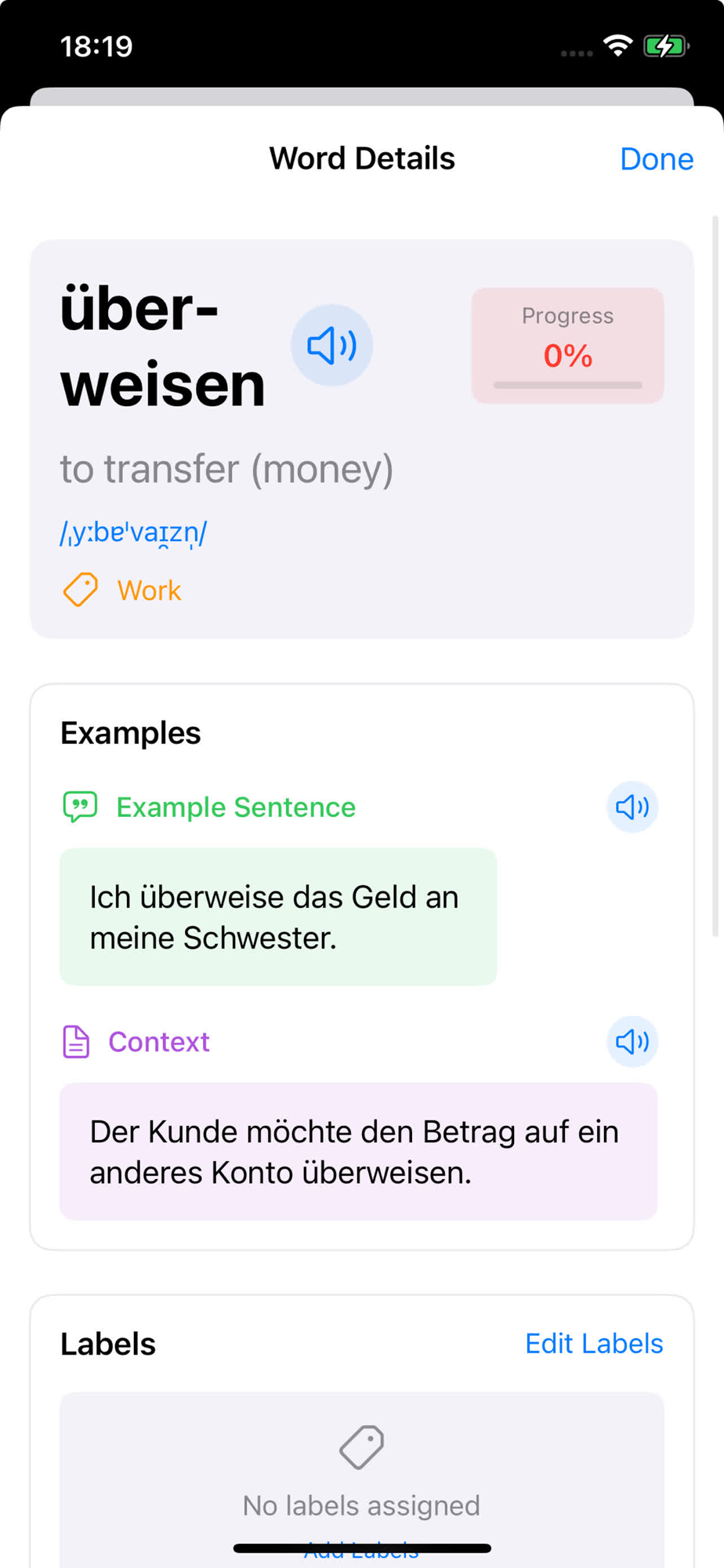 Create custom color-coded labels for thematic learning. Filter by difficulty, progress level, date added, or custom labels. Advanced search across words, translations, and examples. Sort flexibly and organize your vocabulary your way.