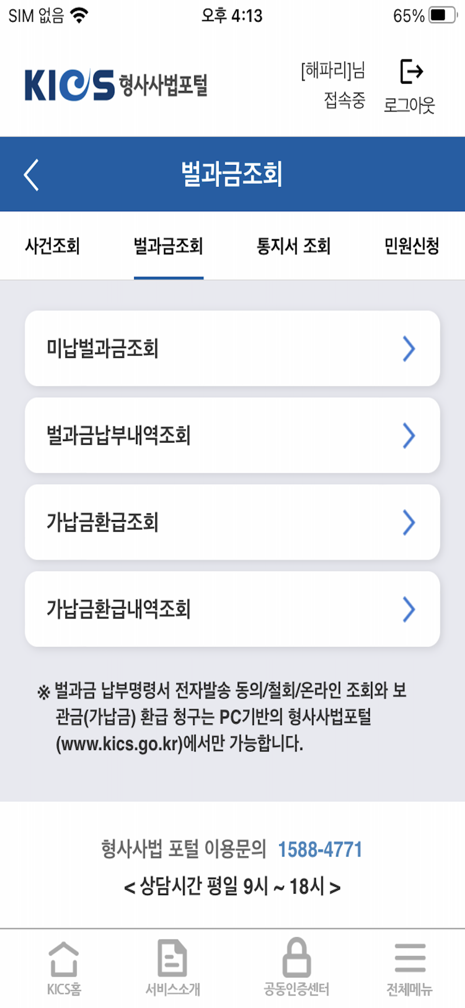 - 실명인증을 통한 회원가입 후 간편인증 로그인 또는 공동인증서 로그인등 : 사건조회, 벌과금조회, 통지서조회, 민원신청, 마이페이지 > 나의 사건목록 조회