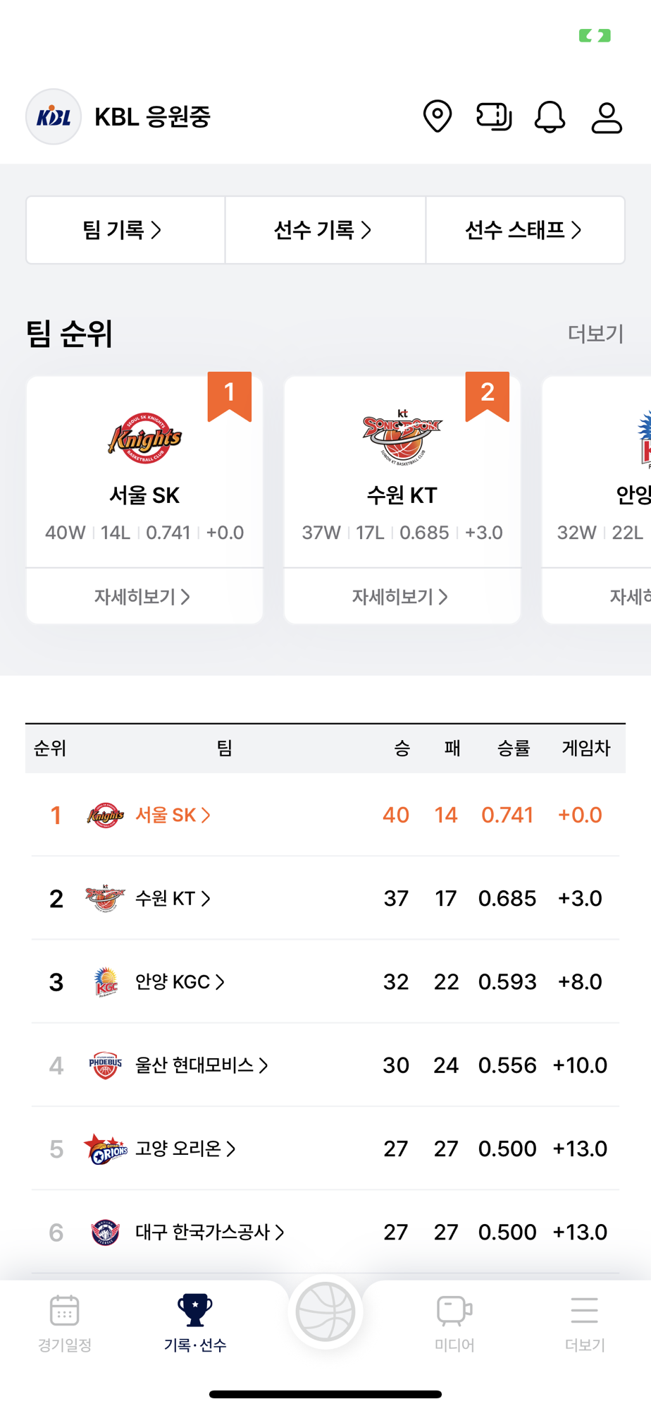 - 경기 실시간 스코어 및 상세기록 제공