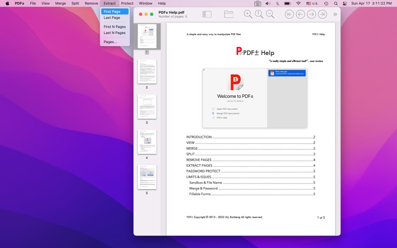 Opposite to merge, the split function of PDF± let you split one document to multiple files. The Split menu provide the command to split a document to two files, three files, or arbitrary N files; it also let you split the document to individual pages, to two files with odd and even pages.