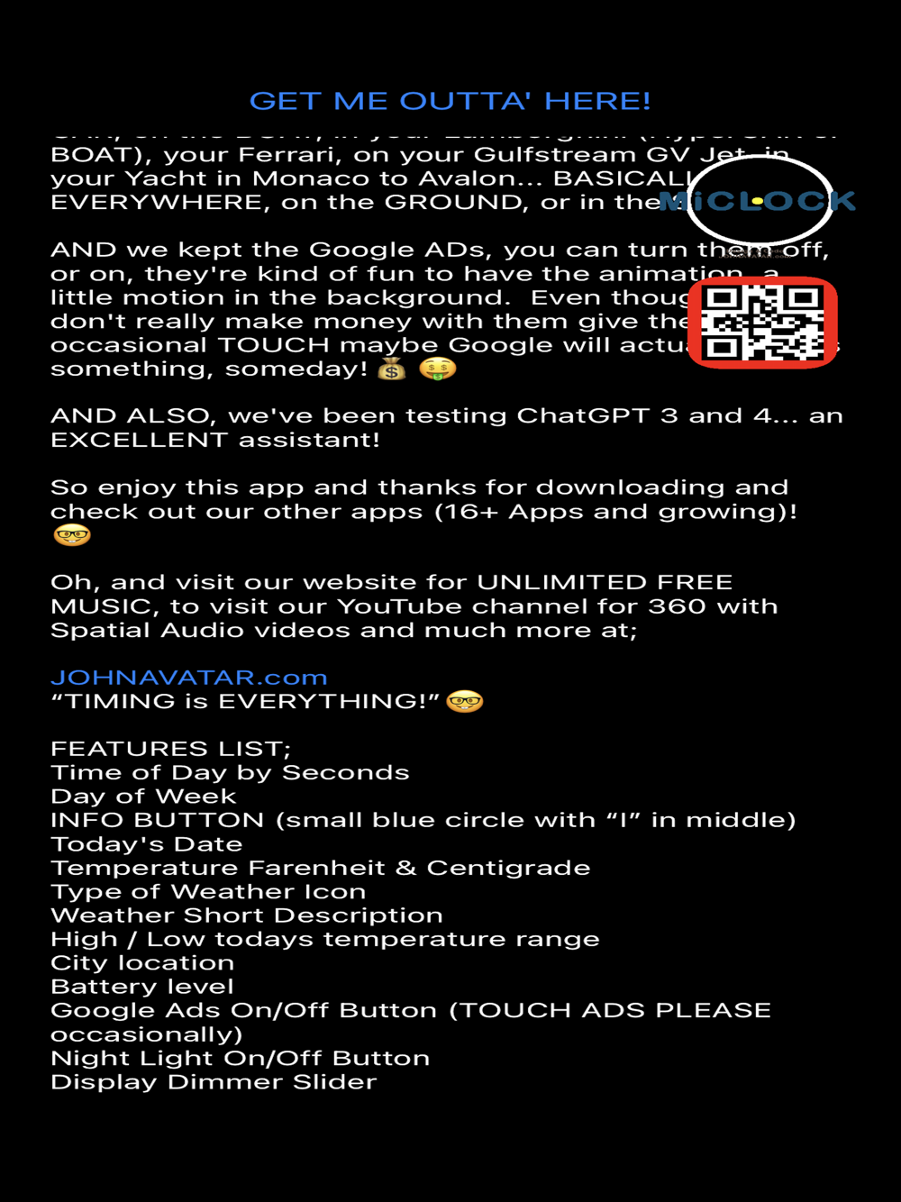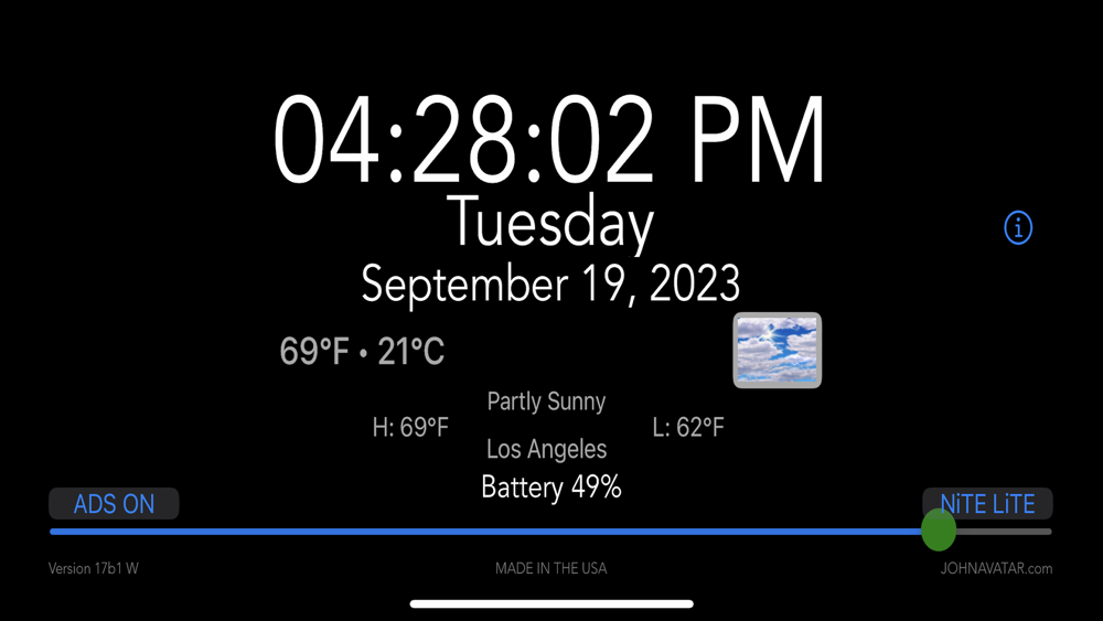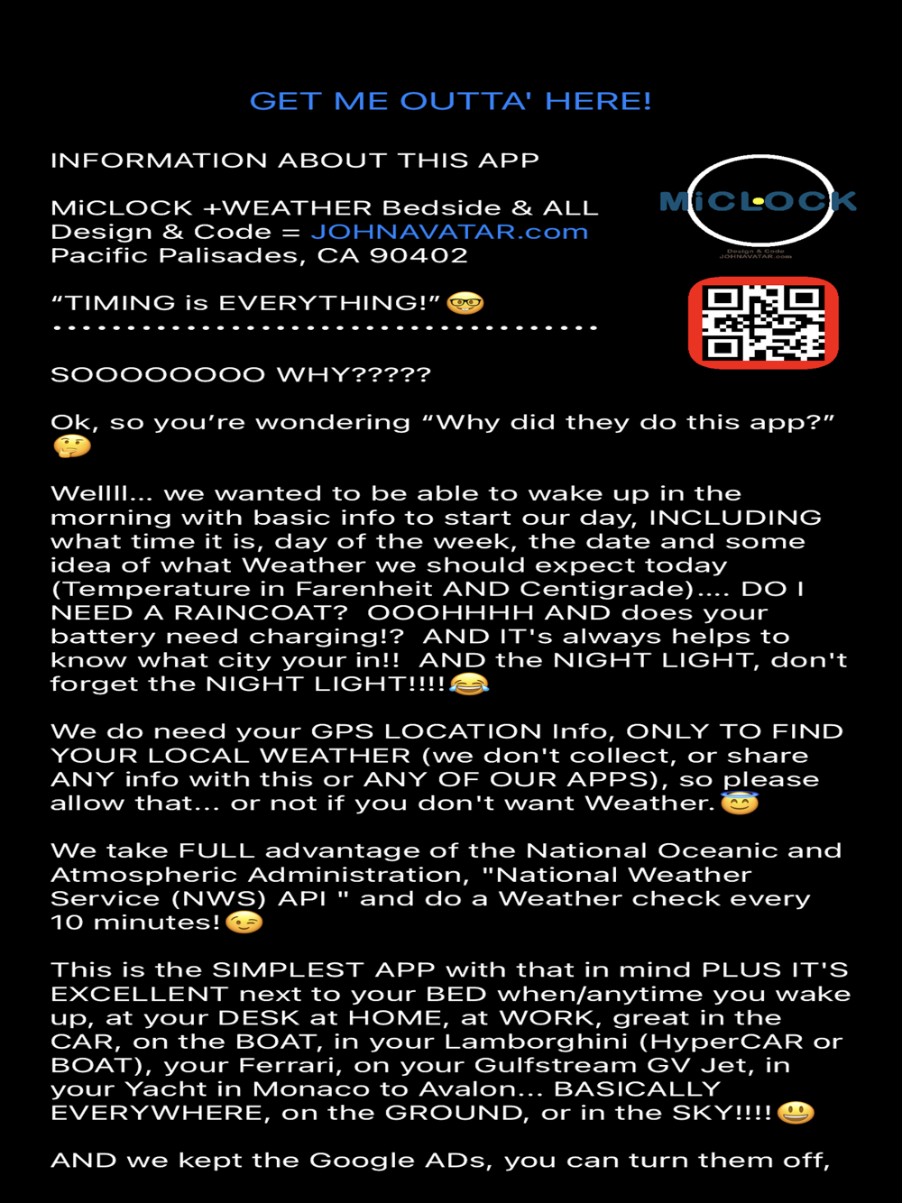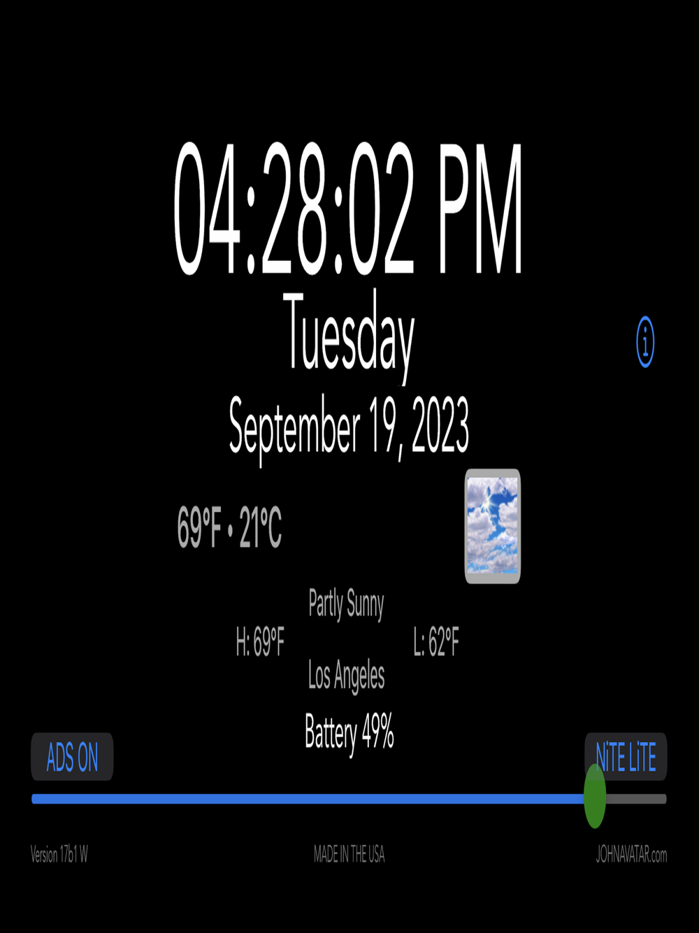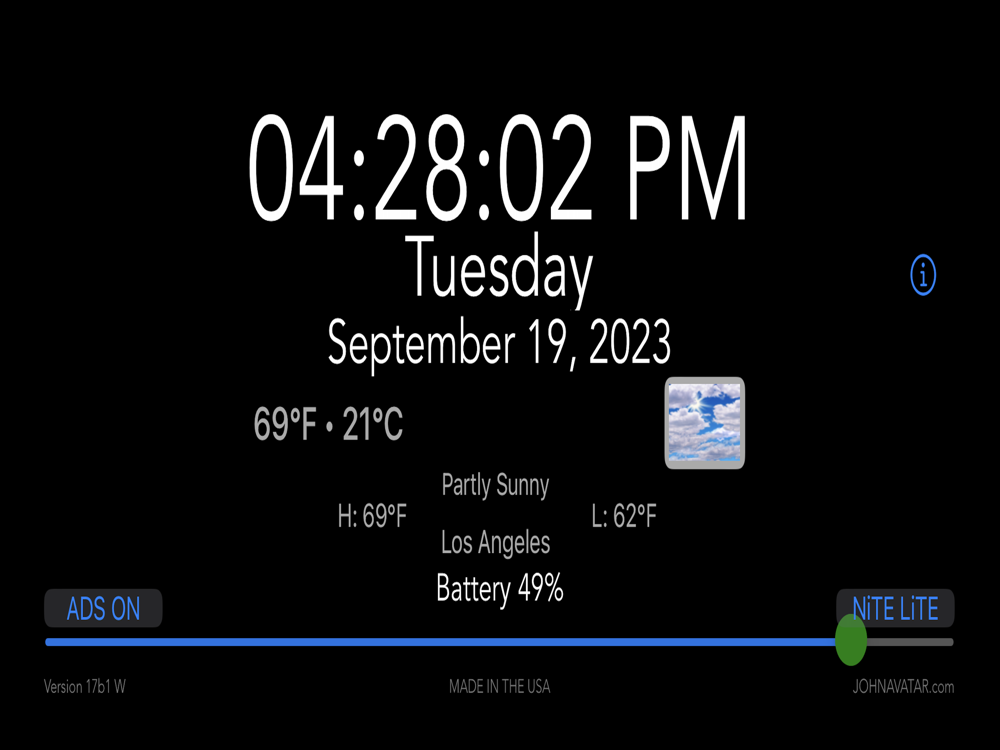 AND Added AM/PM to time display, NOW you know if it's morning or night (if you live in a cave!)!:*), ALSO Added a Nite Lite (to help in your cave, let there be light!) and Toggle button to Turn On/Off Ads (I like the Ads, they add some color and animation).... Fully tested on my iPhone 12 Pro iOS and newish iPad! Yippee!