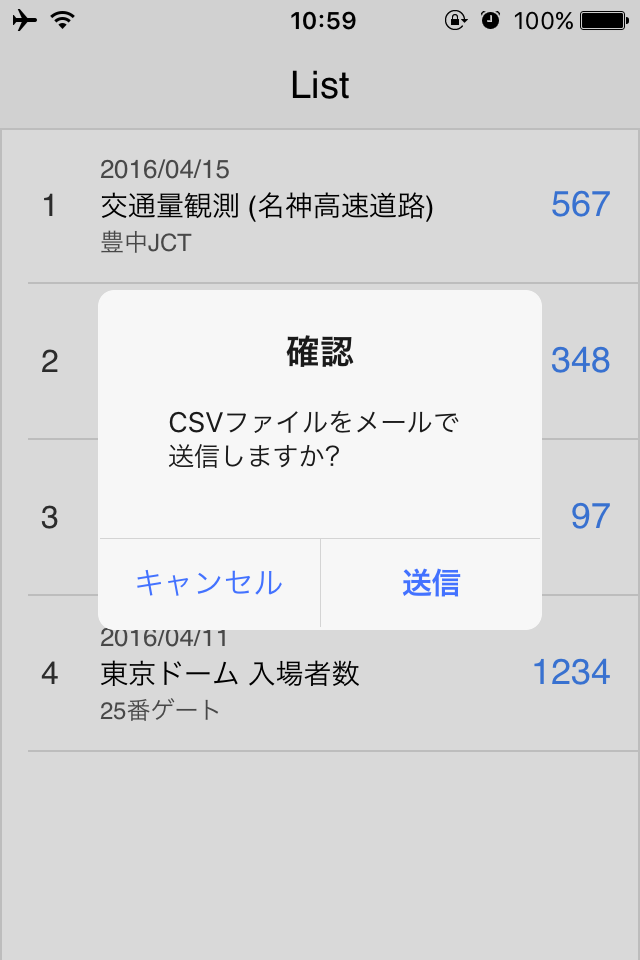 iPhone の画面上にあるボタンをタップして数をカウントします。イベント会場の人数や交通量の観測など様々な用途にご利用いただけます。カウントした日付・タイトル・メモ・カウント数は履歴として保存され、CSVファイルで出力することができます。