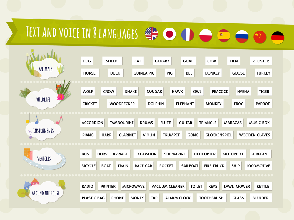 •	6 categories: Animals, Wildlife, Around the house, Vehicles, Instruments, Mixed