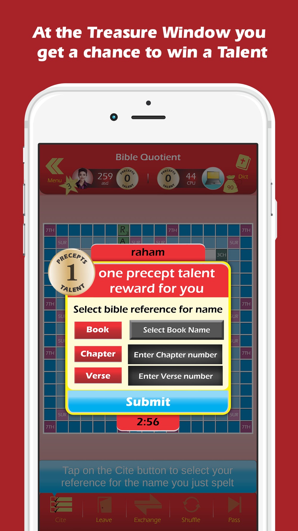 Precepts is a type of crosswords board game. You earn points by forming words found in the Holy Bible on the board in crossword pattern, horizontally and vertically (words flow left to right in rows or downwards in columns). Placing letters on any of the 5 bonus squares boosts your score. Precepts allows English words mentioned in the Bible, as well as words exclusive to the Bible, such as names of places, persons and title of books in the Bible. The player’s Bible intelligence is the Bible Quotient: game score based on 2 scales. First, game points are earned for words spelt. Then a higher score scale, the number of Talents won for correct citation of Bible references. You win a Talent (golden coin) by forming the name of a Bible character on the Thummim (7TH) premium square.