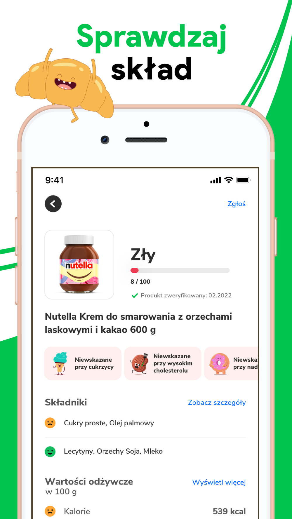 W aplikacji sprawdzisz skład oraz wartości odżywcze produktów. Dostępna jest również ogólna ocena produktu - szybko sprawdzisz, jak oceniliśmy produkt. Aplikacja pokazuje wartości odżywcze: wartość energetyczna (kalorie), tłuszcze, kwasy tłuszczowe nasycone, cukry, białko, błonnik pokarmowy, sól.