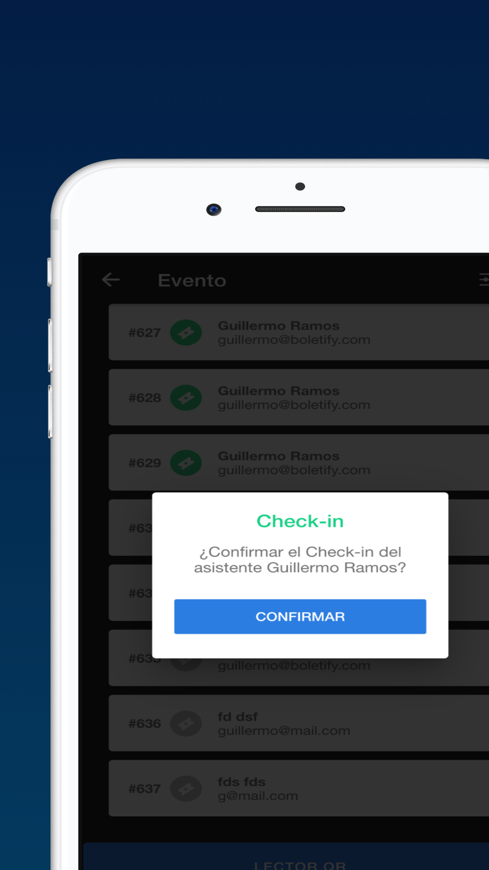 Aplicación para realizar el checkin de tu conferencia, congreso o cualquier evento que hayas generado en Boletify.