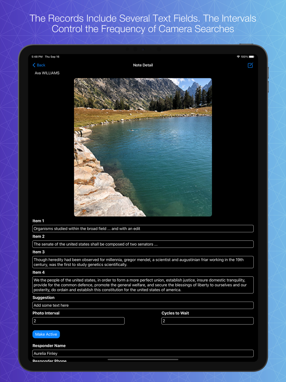 The voice prompts rely on the recipient looking at the Display iPad so the Display iPad should be in a position frequented by the recipient. Furthermore, it is important to be position such that the recipient looks at the iPad (camera). The camera is used to detect a face (any face, not face recognition). Once detected the Display iPad speaks the text that was entered into the record. The concept is that the recipient could be reminded to look at the screen where, for example, the daily diary is posted.
