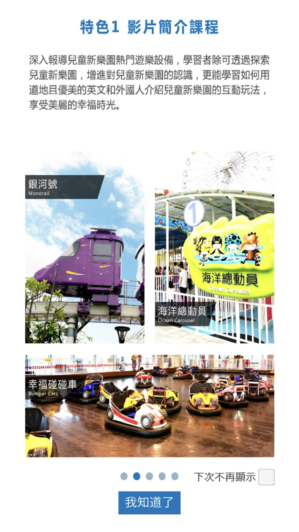量身訂作兒童新樂園互動影音英語學習內容,透過GPS+AR技術,走到哪,學到哪。每個遊具都有特色主題課程,讓你來到兒童新樂園隨時都能玩出新風貌。