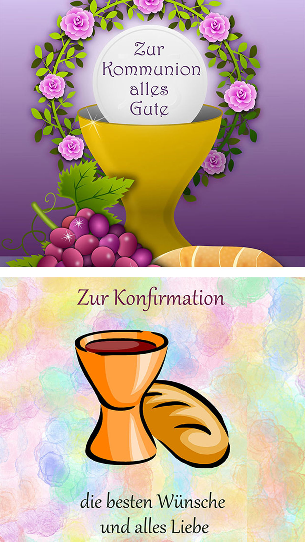 Herzlichen Glückwunsch zur Kommunion oder Konfirmation! Hier finden Sie eine große Auswahl an Gruß- und Glückwunschkarten für beide Anlässe – bereits fertig beschriftet, oder gestalten Sie Ihre eigene Karte.Mit dieser App ist beides möglich – und ganz einfach.