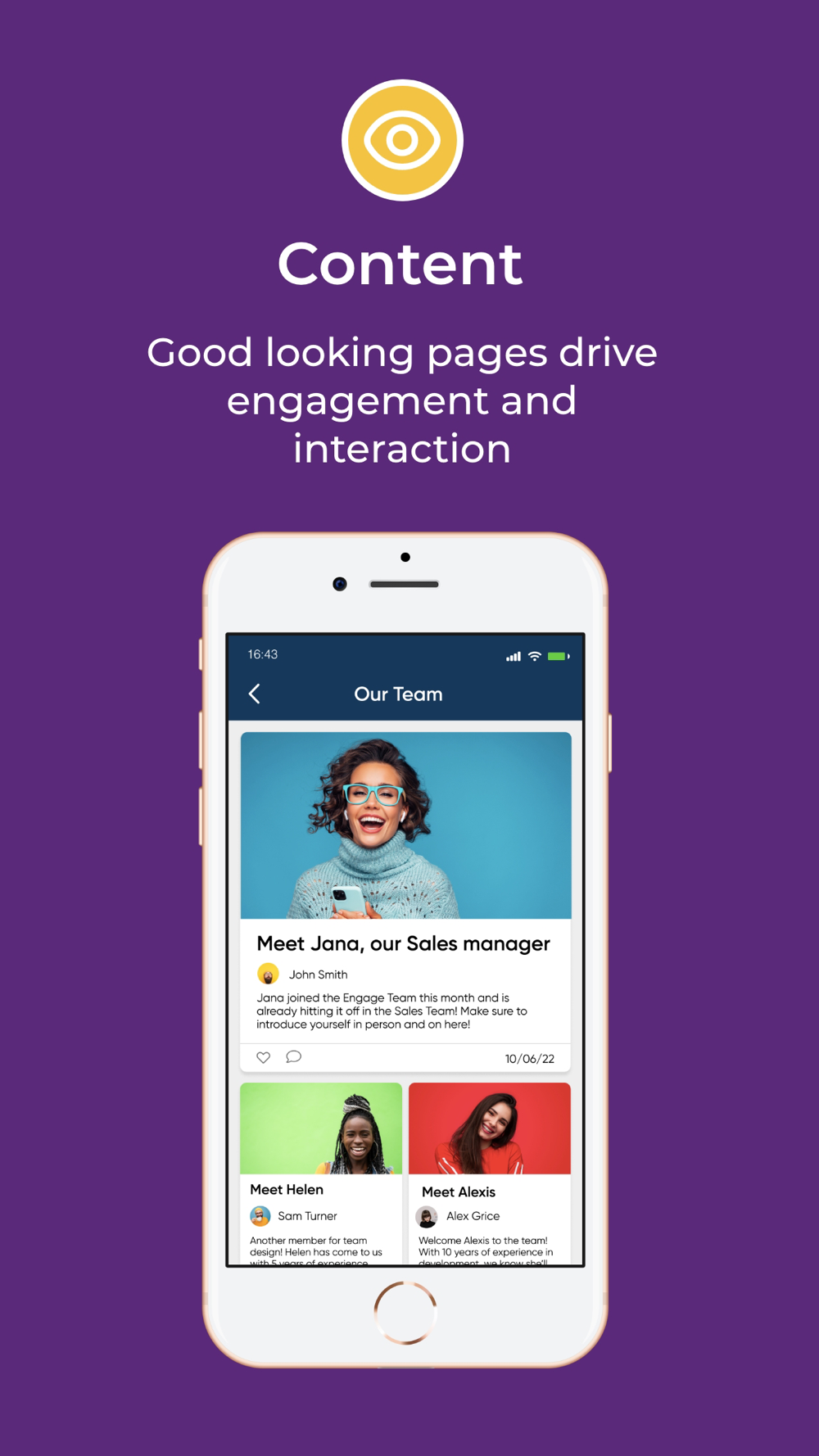 Framed around our five pillars of engagement – communications, accessibility, enablement, recognition and feedback – Engage comes with a rich ‘starter pack’ of functions and tools that mirror those pillars. As a business, your workforce has the option to extend the platform at their own pace: our API layer offers seamless integration with other operational, HR and line of business systems, allowing for the creation of fully customised people platforms. With its single sign-on capability, the app becomes an effective ‘window on the working world’, bringing everything together in one place, accessible with one touch.