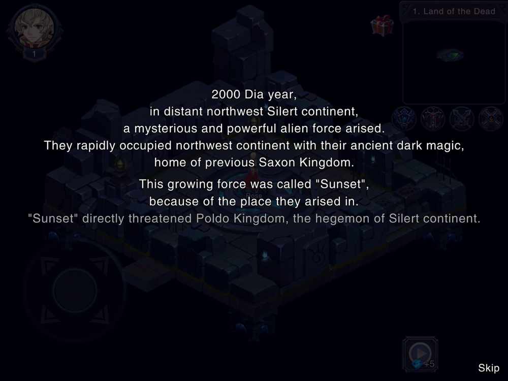 2000 Dia year, &in distant northwest Silert continent,&a mysterious and powerful alien force arised.&They rapidly occupied northwest continent with their ancient dark magic,&home of previous Saxon Kingdom.&This growing force was called "Sunset",&because of the place they arised in.&"Sunset" directly threatened Poldo Kingdom, the hegemon of Silert continent.&Meanwhile, the light of holy sword "Shionoway" faded away...&It had been guarding Poldo Kingdom for thousands of years.&It seemed that Poldo Kingdom was doomed,&and everyone had no doubt about it.