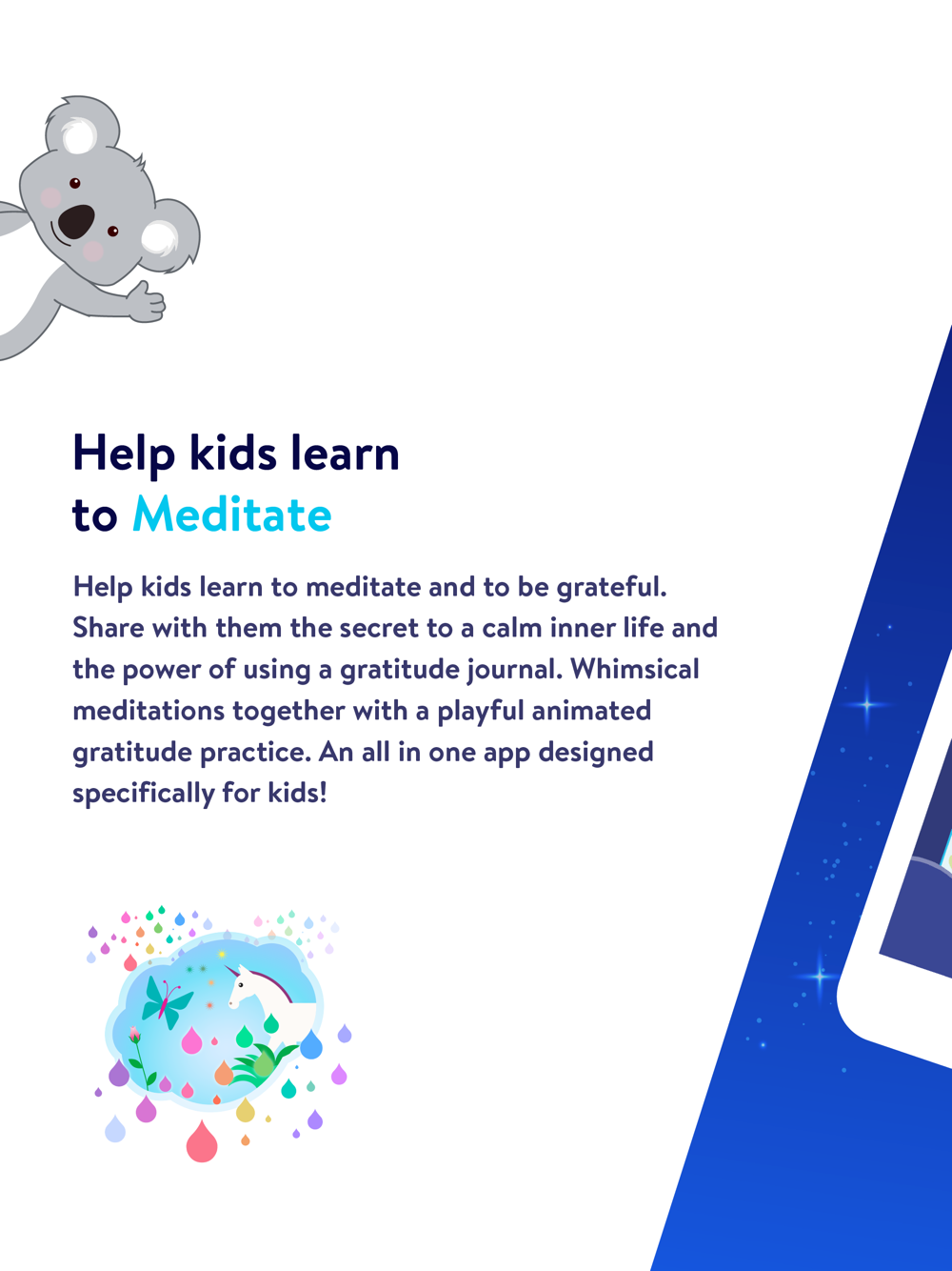 An easy to use, elegant children's meditation app with 100+ meditations, hypnosis and sleep stories - just for kids! The gratitude journal along with whimsical kids meditations and hypnosis stories, beautiful music, sound effects and story, this simple app provides the platform for children to learn about mindfulness and gratitude. Mindfulness and gratitude form the basis of a happier, healthier and more authentic life.