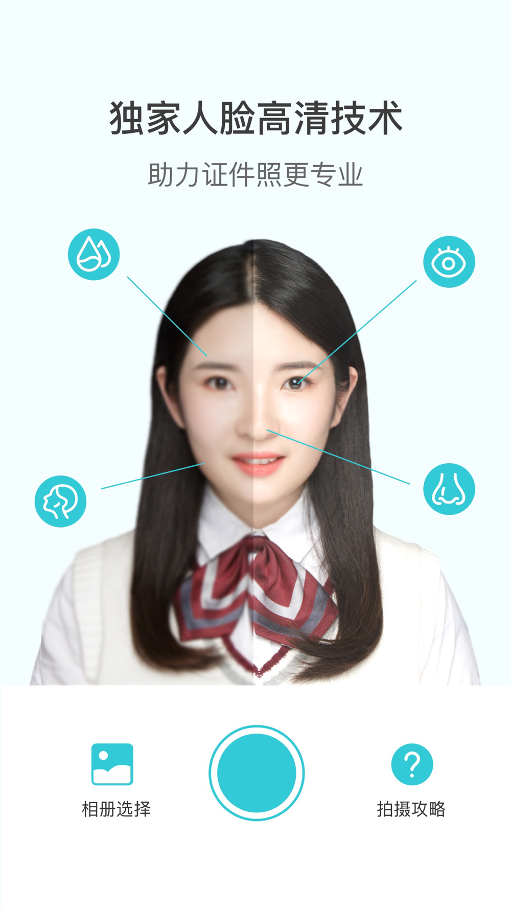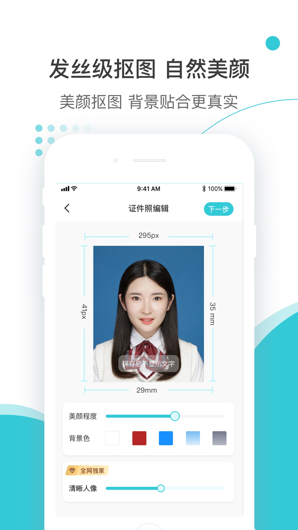 【高清人像 美颜自然】独家人脸高清技术,确保你的证件照高清又合格;一键设置美颜等级,AI自然美肤美颜,给你好看合格证件照。多种背景色随意切换,融合自然。