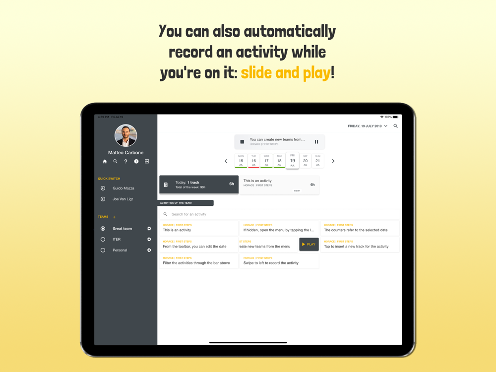 Tracking your daily activities shouldn't be an activity itself. Insert your tracks in a few seconds, or directly use the play/pause/stop function to automize the action.