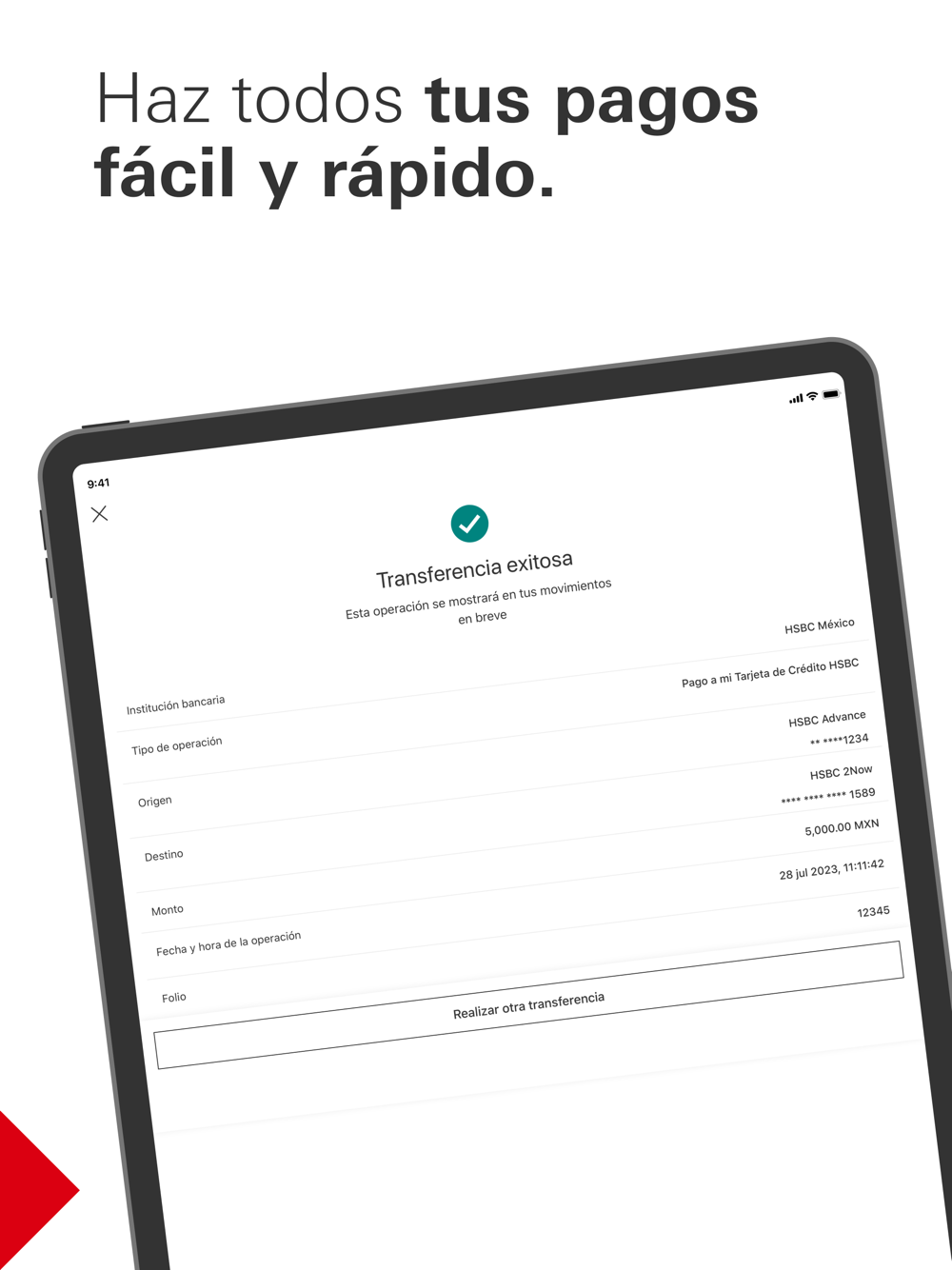 - Paga tu tarjeta de crédito HSBC desde el acceso directo en el menú "Transferir y pagar".