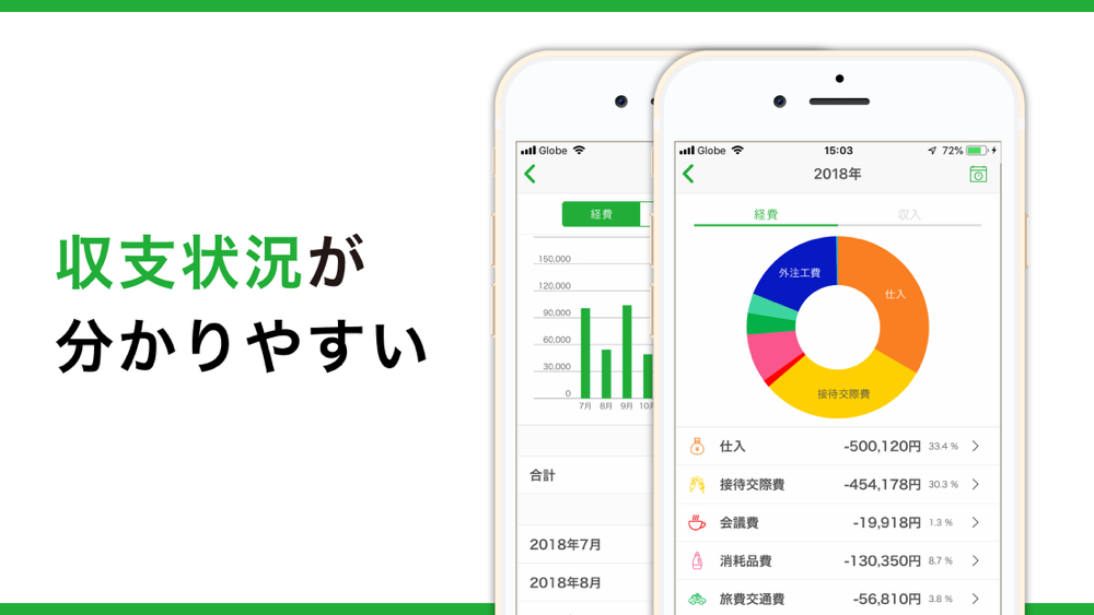 月々の収入・経費を円グラフ化して、収支の状況を把握することができます。
