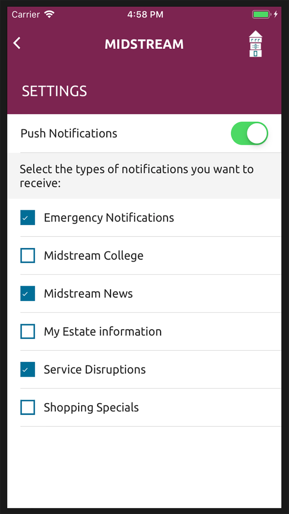 Choose the option that allows Midstream to send you push notifications like, emergency notifications, news, estate information, service disruptions and more. You can opt in or out of any of the topics and also disable push notifications entirely. You will need to give the app permission to send you push notifications.