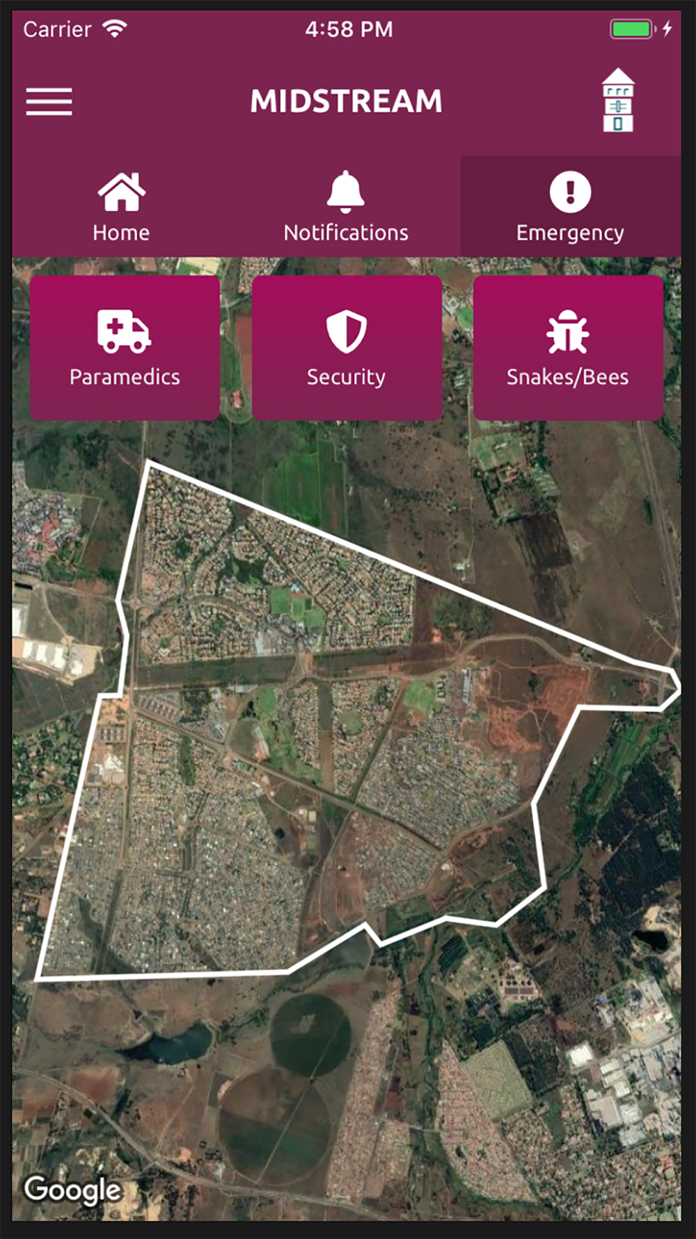 Residents of Midstream Estate can use the app to send emergency requests for Paramedics, Security and Snakes and Bees. The app is used to notify residents of events and service disruptions through push notifications. It also features a directory of all the shops and services within Midstream Estate.