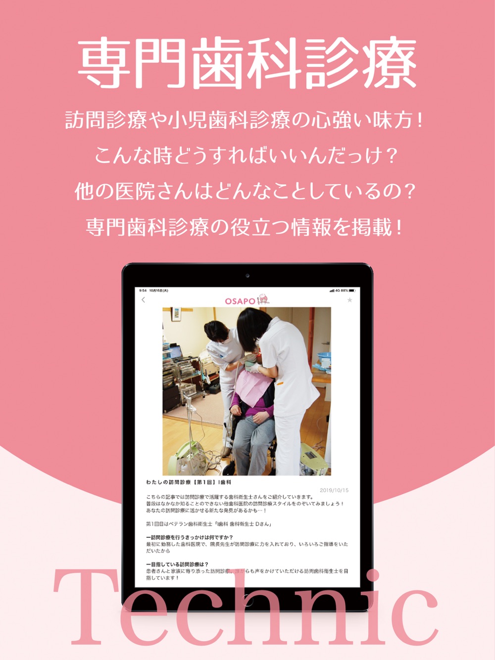 こんな時どうすればいいんだっけ?他の医院の歯科衛生士さんはどんなことしているの?訪問先での困りごとも、オサダポータルアプリならその場でチェックできます!