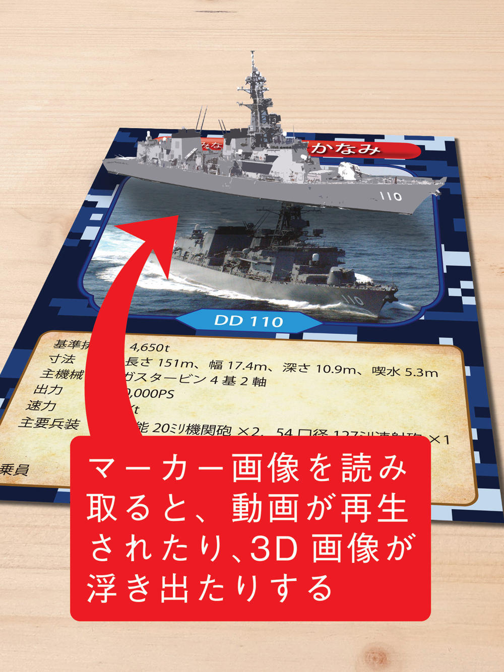・海上自衛隊カードの裏面に、このアプリを起動したスマホをかざすと艦艇や航空機の動画が表示されます。(全5種)