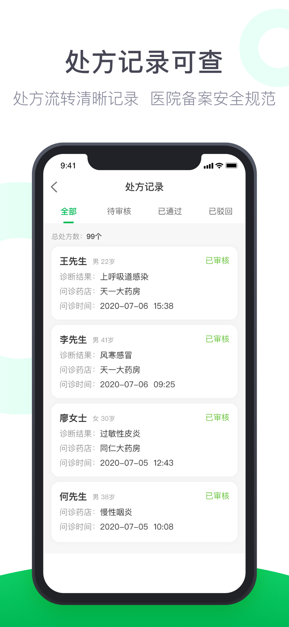【规范开方】在线开具处方经CA电子签名认证,权威可靠;处方流转清晰记录,医院备案安全规范。
