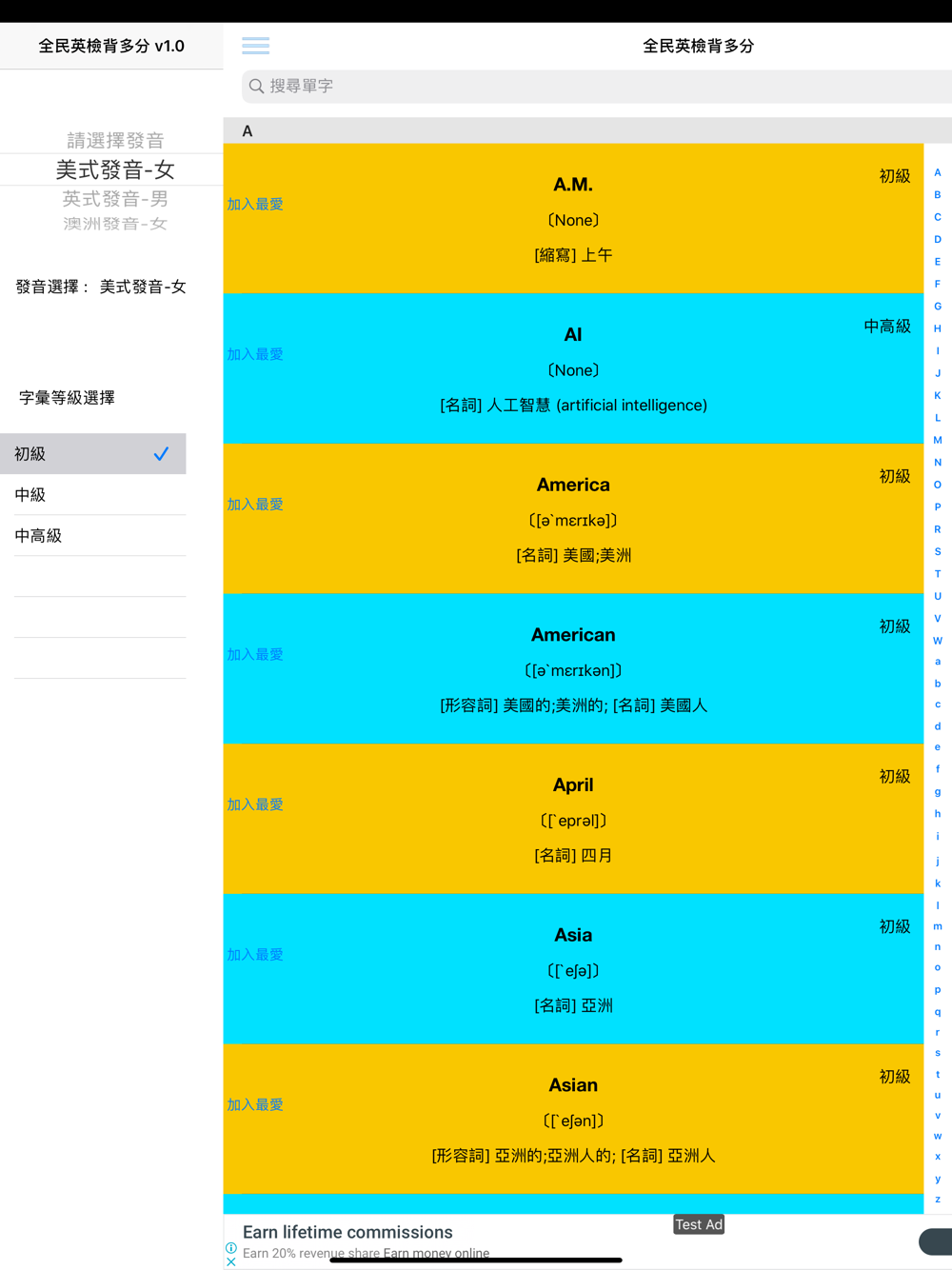 收錄GEPT全民英檢的「8,000 英文單字」,APP功能簡單易用,依照英文字母順序(A-Z)排列,並提供索引及搜尋功能