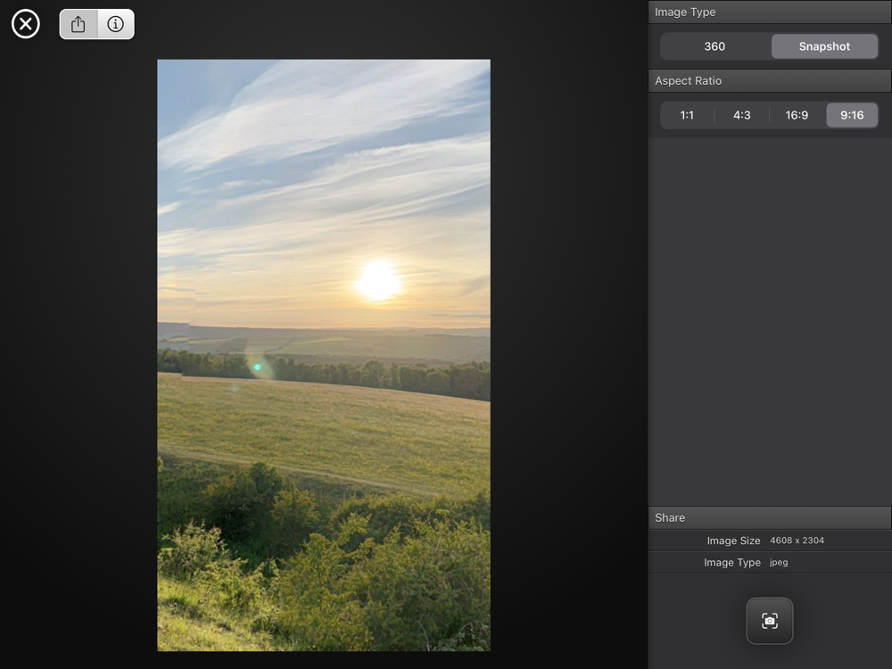 While viewing a photo in Spherium you can share the entire 360 photo, or take snapshots of portions of the image for sharing.