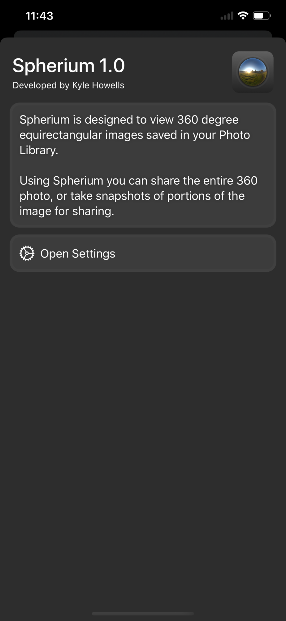 Spherium is designed to easily view and share 360 degree images saved in your Photo Library.