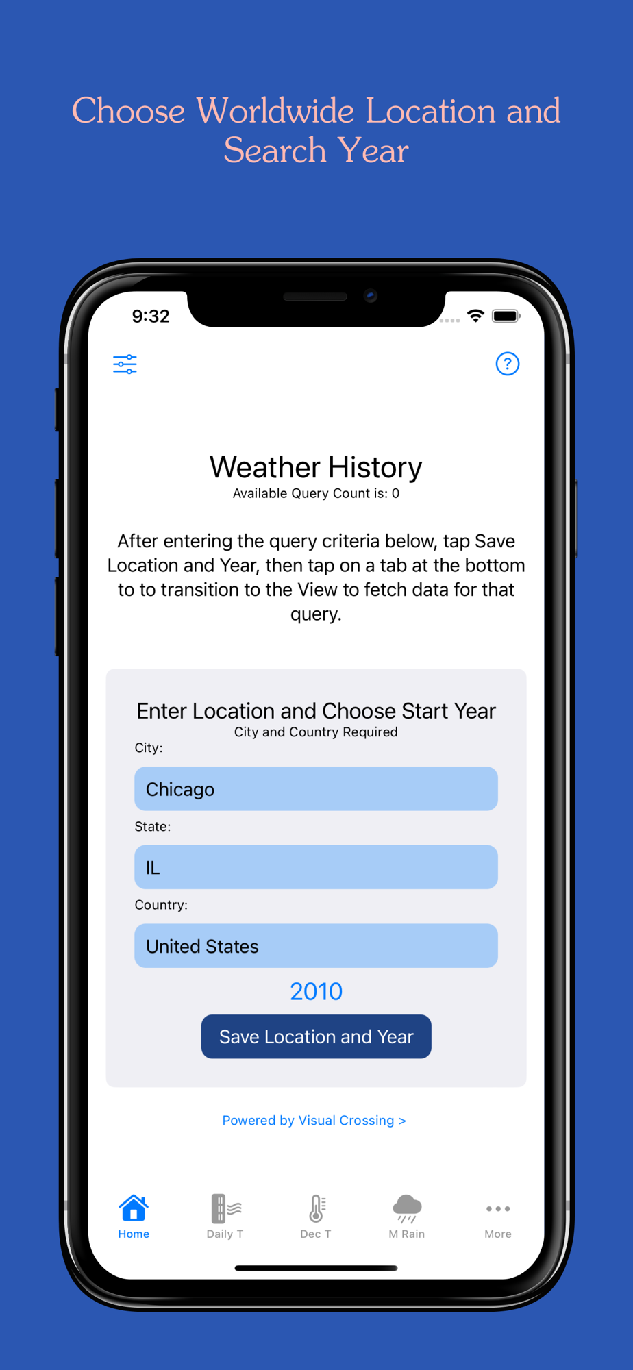 This app provides historical weather data for user specified locations and time periods. The data elements are minimum/maximum temperature, precipitation, windspeed and humidity. The default graphs summarize temperature by day for a 12 month period and yearly and decade summaries for precipitation, windspeed and humidity.