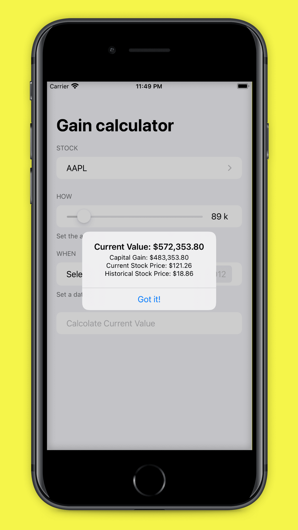 This App allows you to calculate the return on investment in companies listed on Nasdaq, NYSE and AMEX.
