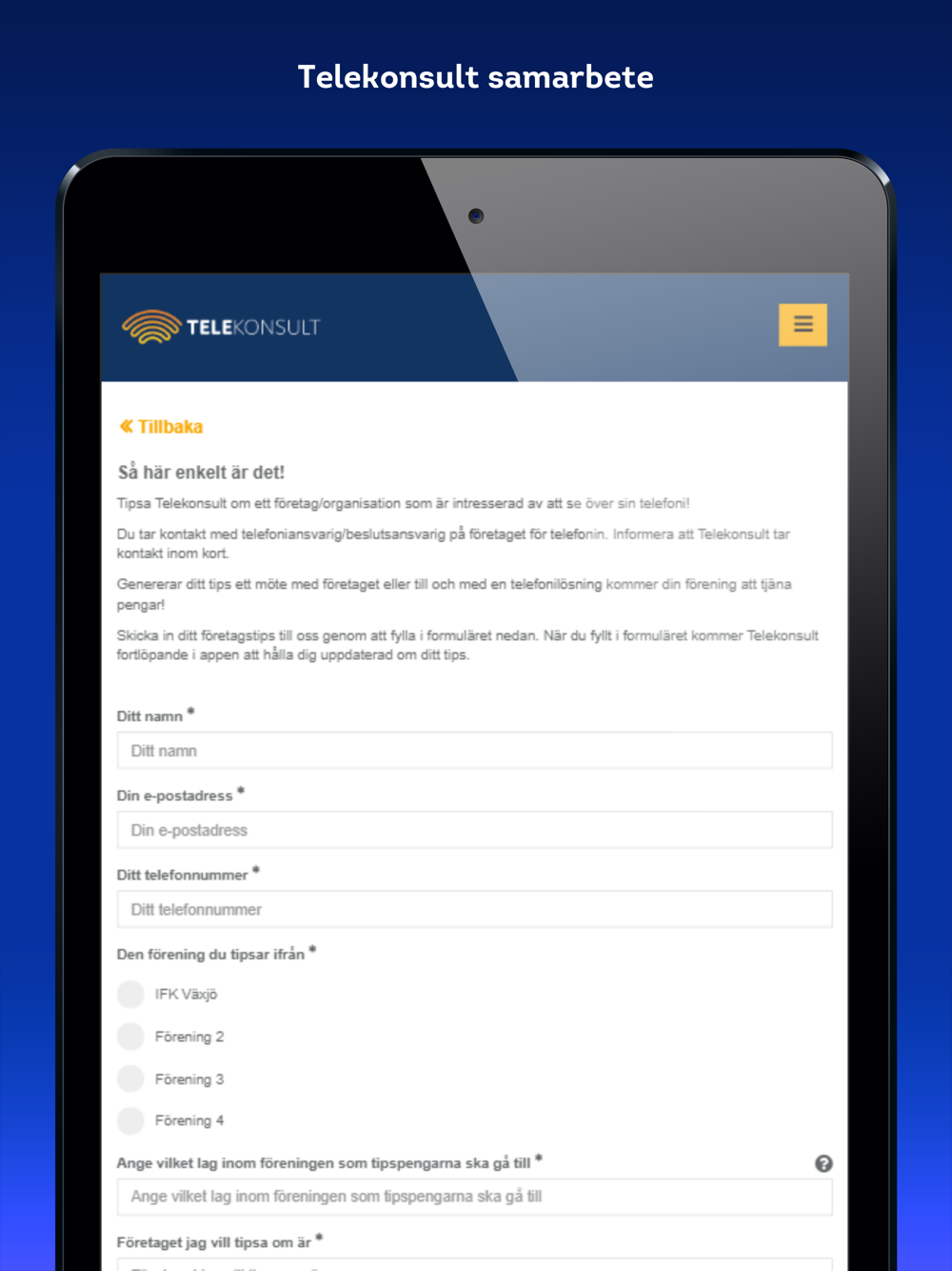 Som marknadsledande leverantör av telefonlösningar jobbar vi på Telekonsult med att erbjuda företag den bästa lösningen när det gäller företagstelefoni. Vår app för samarbete är till för att föreningar ska kunna tipsa oss om nya kunder och samtidigt tjäna pengar. I utbyte mot och som tack för ett lyckat tips får föreningen pengar från oss.