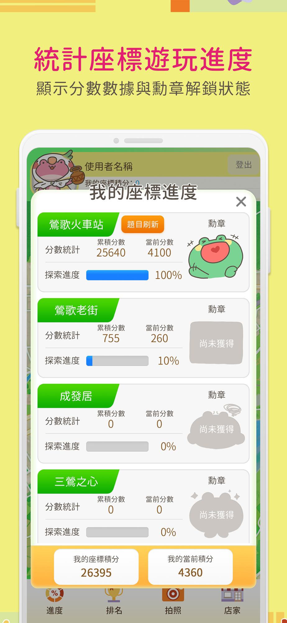 地圖上共有10個座標,分別為鶯歌火車站、成發居、鶯歌老街、三鶯之心、鶯歌博物館、李梅樹紀念館、愛鄰醫院、三峽拱橋、三峽祖師廟、三峽老街,座標謎題闖關完成,就可以收集到可愛的蛙蛙徽章喔!