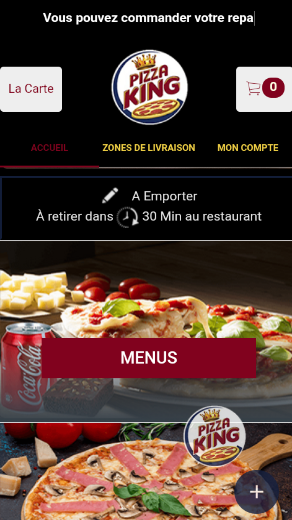 L'application Pizza King vous permet de commander en ligne ou par téléphone via votre application. Vous pouvez consulter notre carte et choisir vos produits.