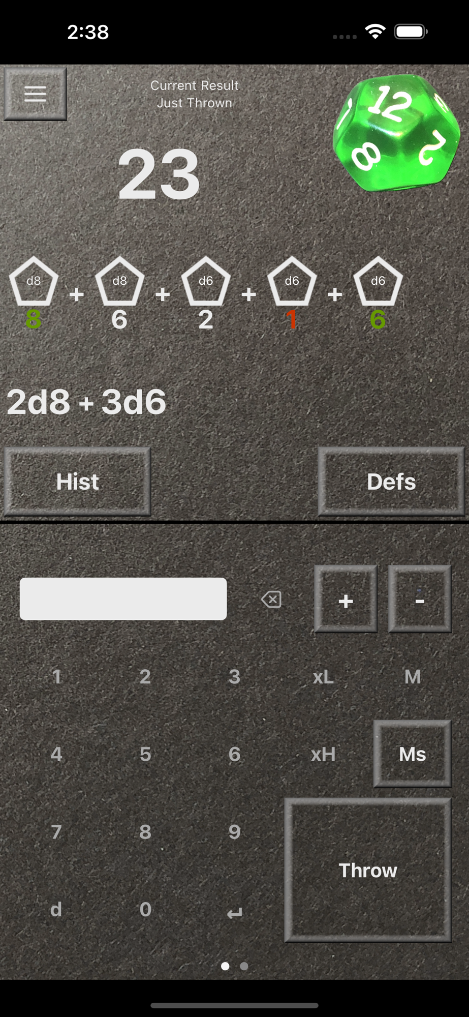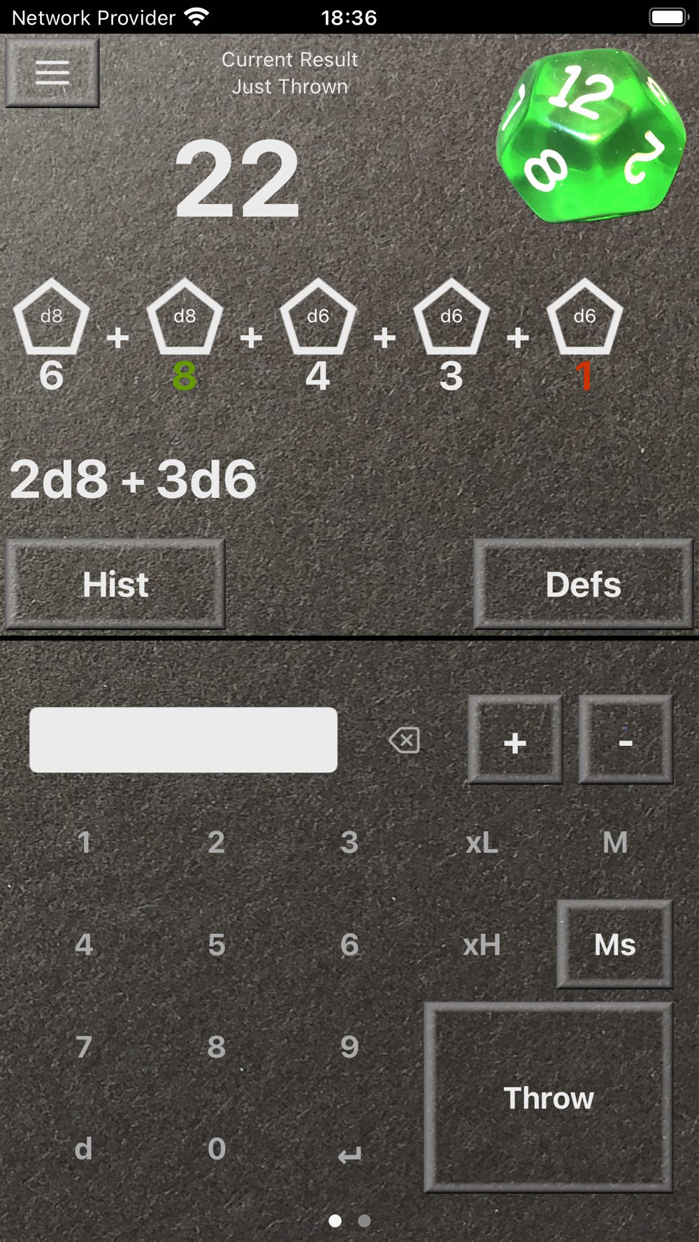 Dice feature brings you regular dice that give numbers as result, but you may freely pick the number of dice and how many sides they have. You can combine dozens of different dice in a single throw if you like. You may also define your own weighted dice where the chance of each side is freely configurable.