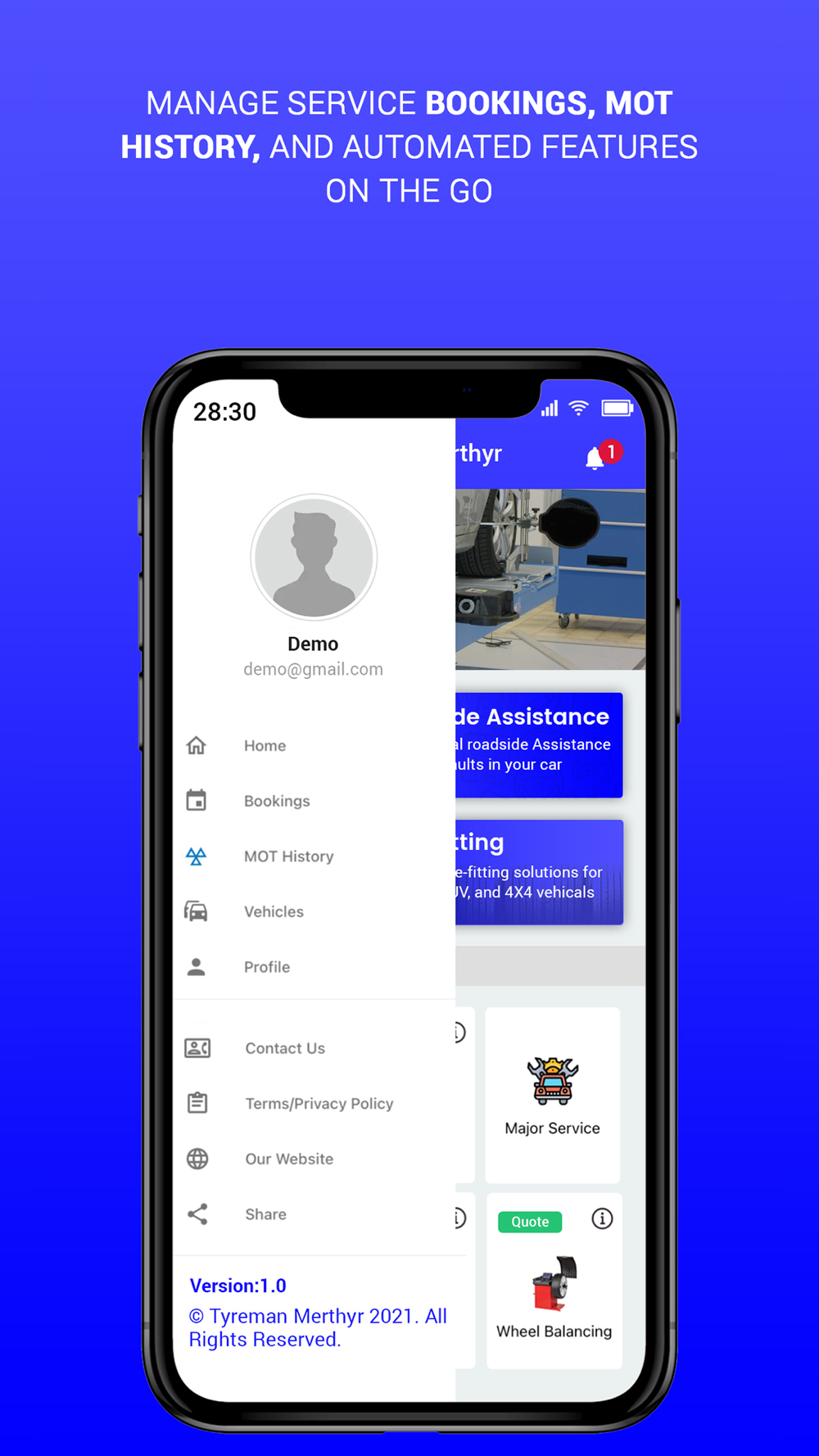 Track your MOT certificate and deadlines coming your way in one click. Get pop-up notifications for your MOT appointments and up-gradation of the vehicle. Explore through the app and find the ideal tyres from several tyre brands available for vehicles of all types in different sizes. Simply add the product or the service you wish to get in the service cart and get an overview of the prices then and there. You can also review your cart, service or product history and track other services through this app. Download the app now to avail exciting offers and great deals waiting for you in the Tyreman Merthyr app.