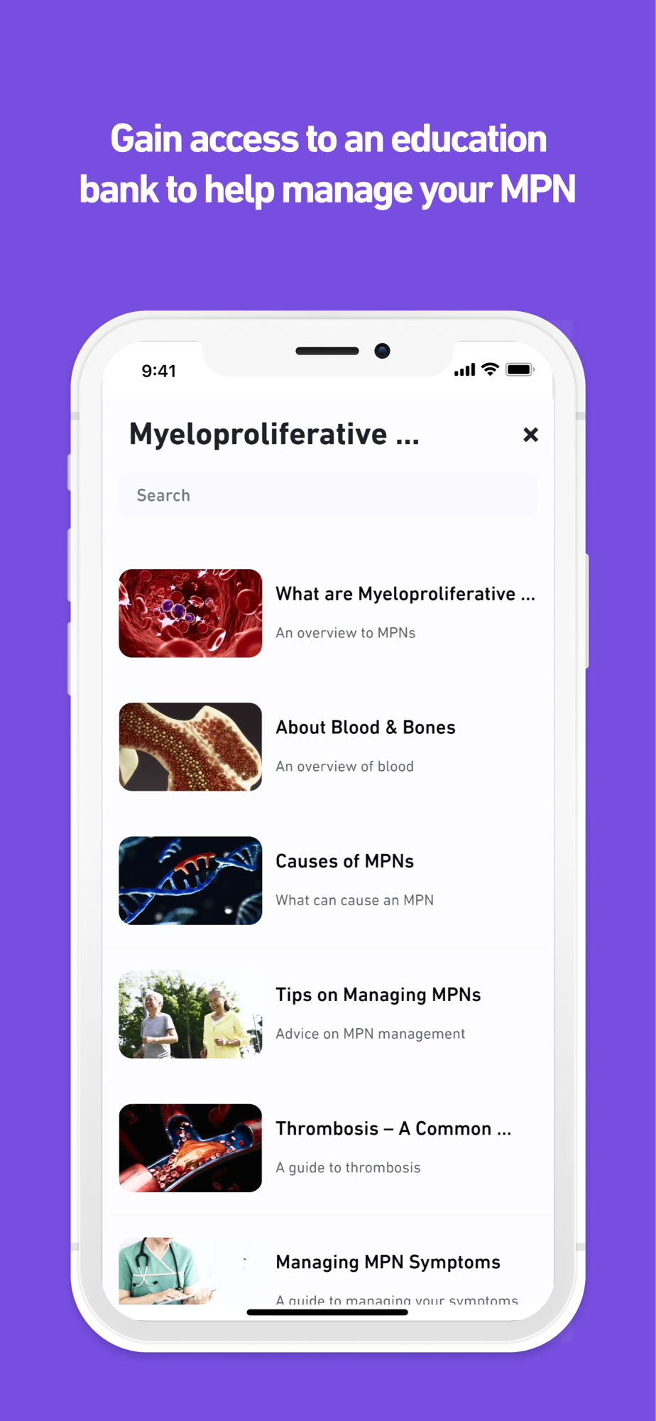 The app also offers a vast library of content to help patients understand MPNs better, as well as how to keep healthy with an MPN condition.