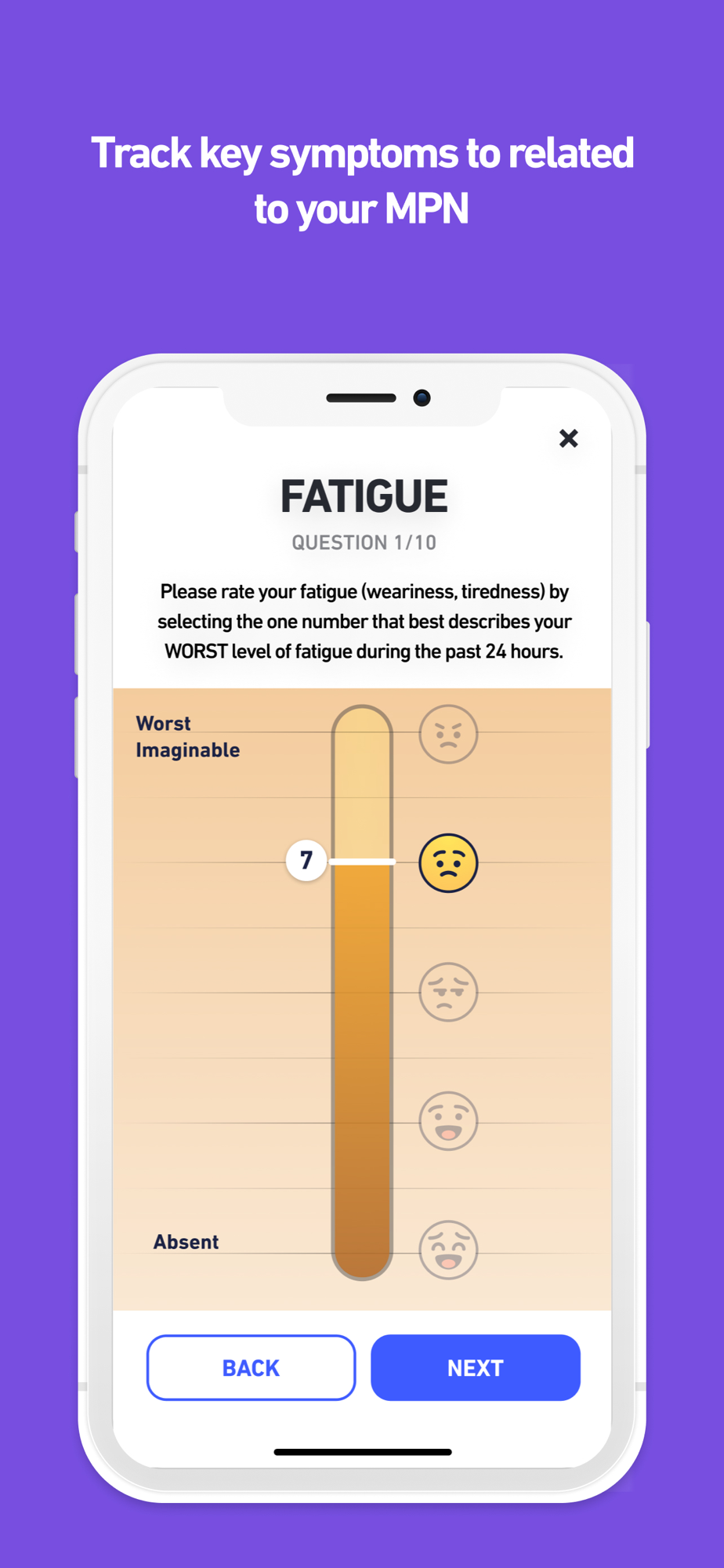 The app has been designed to allow for intuitive and quick input of the various symptoms of myeloproliferative neoplasm. Each day you can record the severity of ten symptoms on a scale of one to ten, with ten being the most severe.