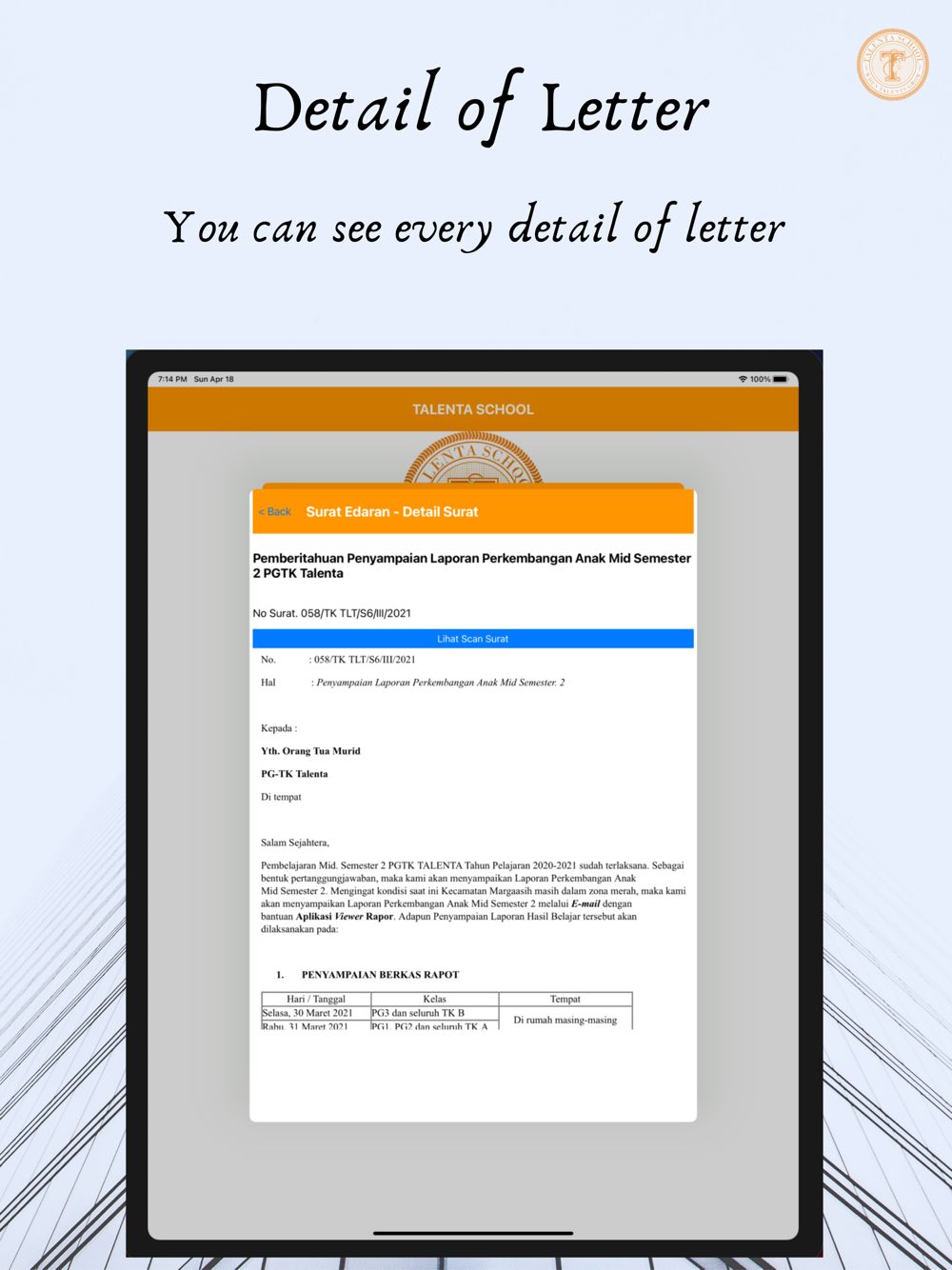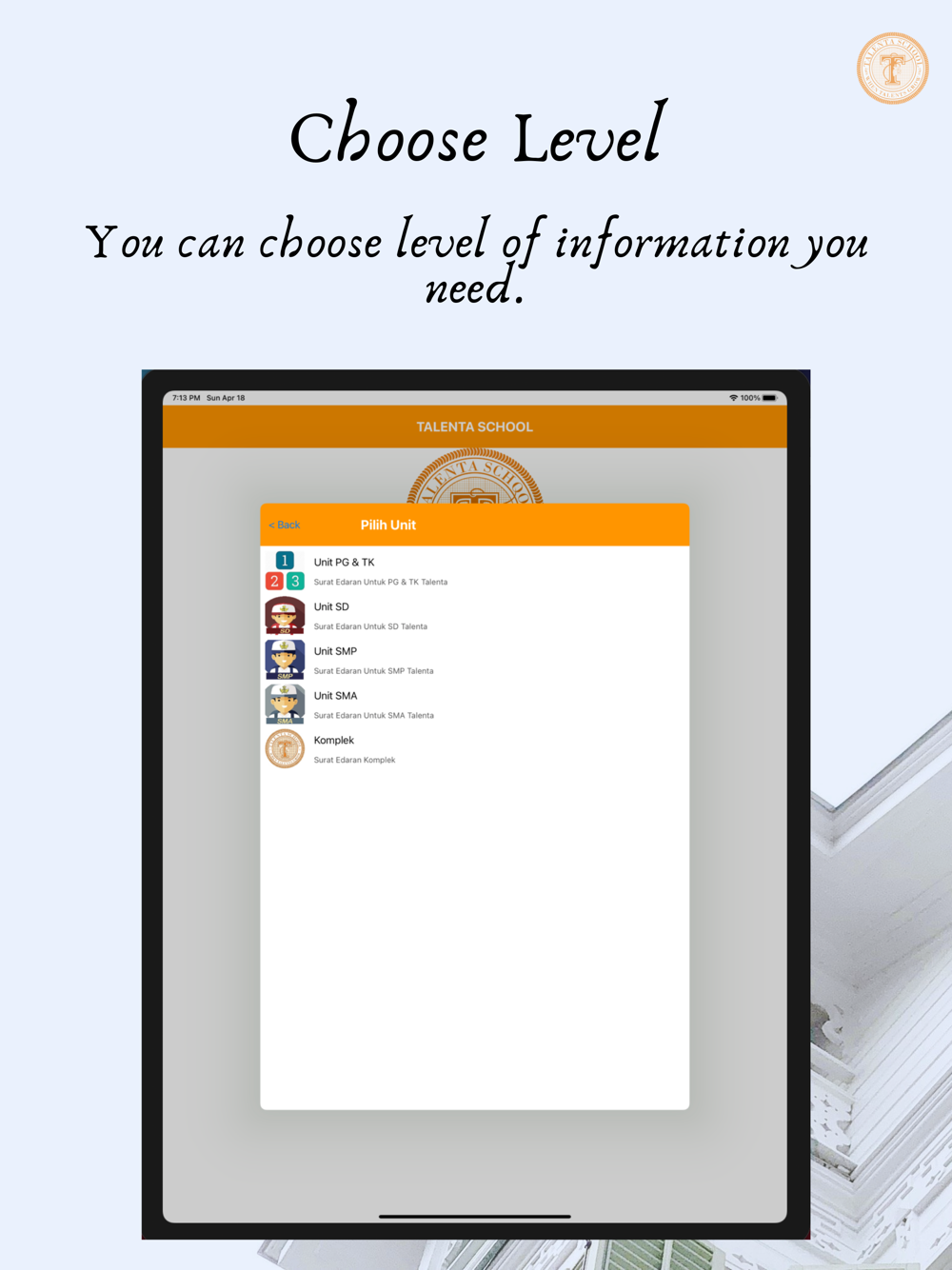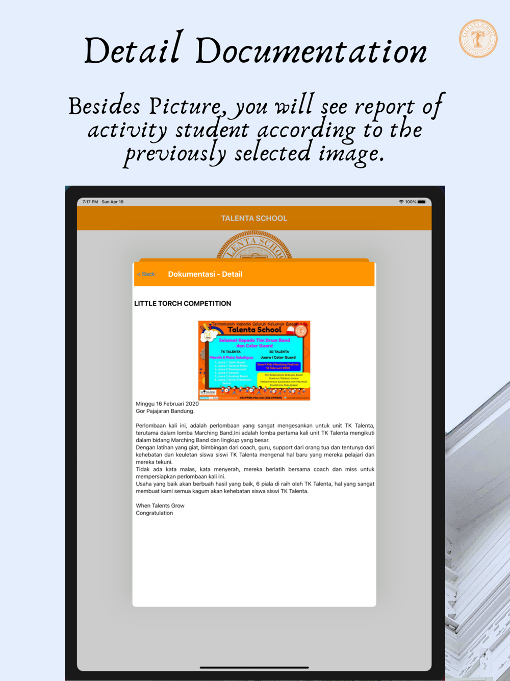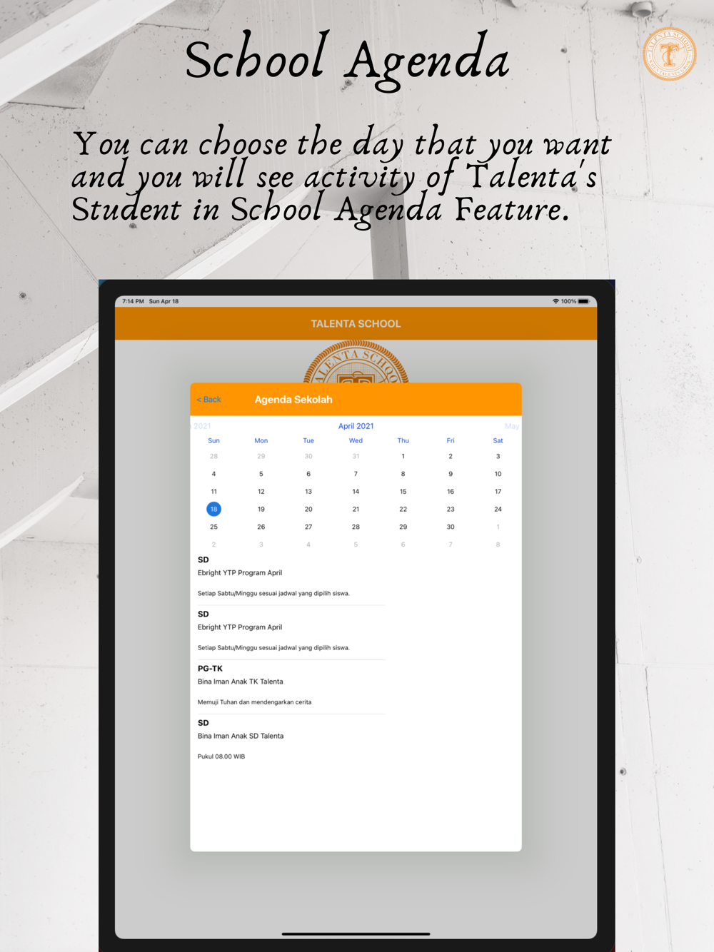 This application is made for Student Portal of Talenta School in Bandung City. This application will contain many activity information about Talenta School for example documentation of activity student, announcement , Calendar School.
