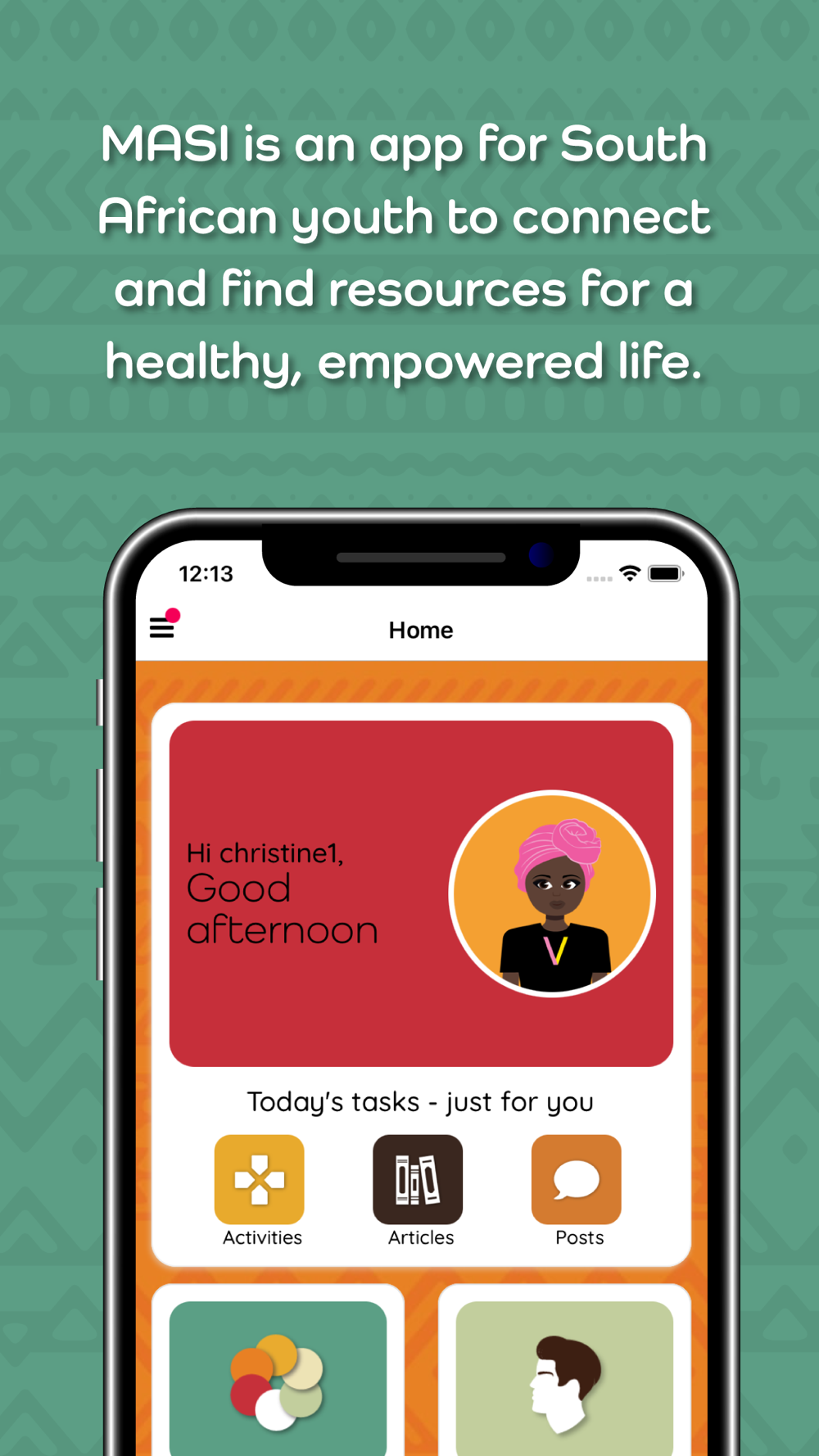 MASI is a research study app for South African adolescents that is designed to foster connections to a supportive community, offer tools for self-monitoring and habit formation, provide resources for goal-setting and action planning, and present engaging informational resources. MASI covers a range of health and wellness topics to support adolescents’ varying needs over time.