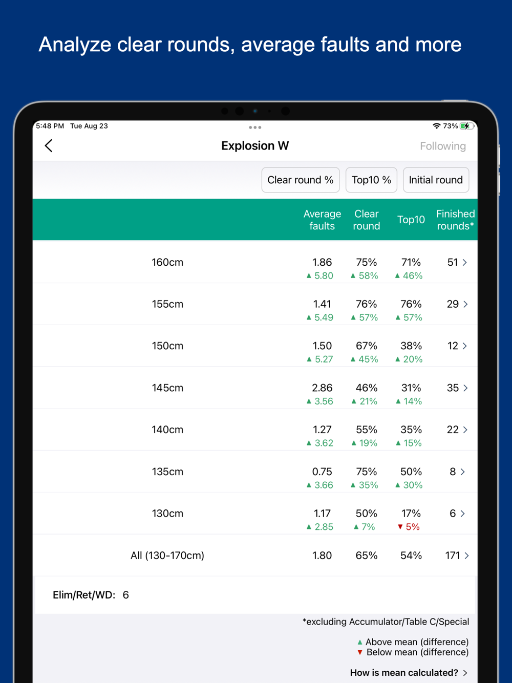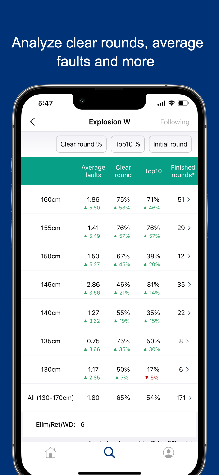 Discover data on clear round percentages, average faults, aggregated prize money, top placings, and more.